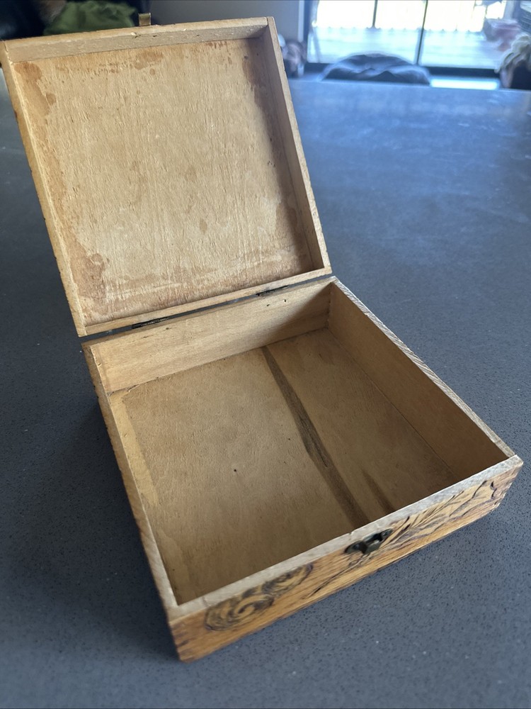 Vintage Pyrography Burned Wood Handkerchief Vanity Box Hinged Lid Leaves