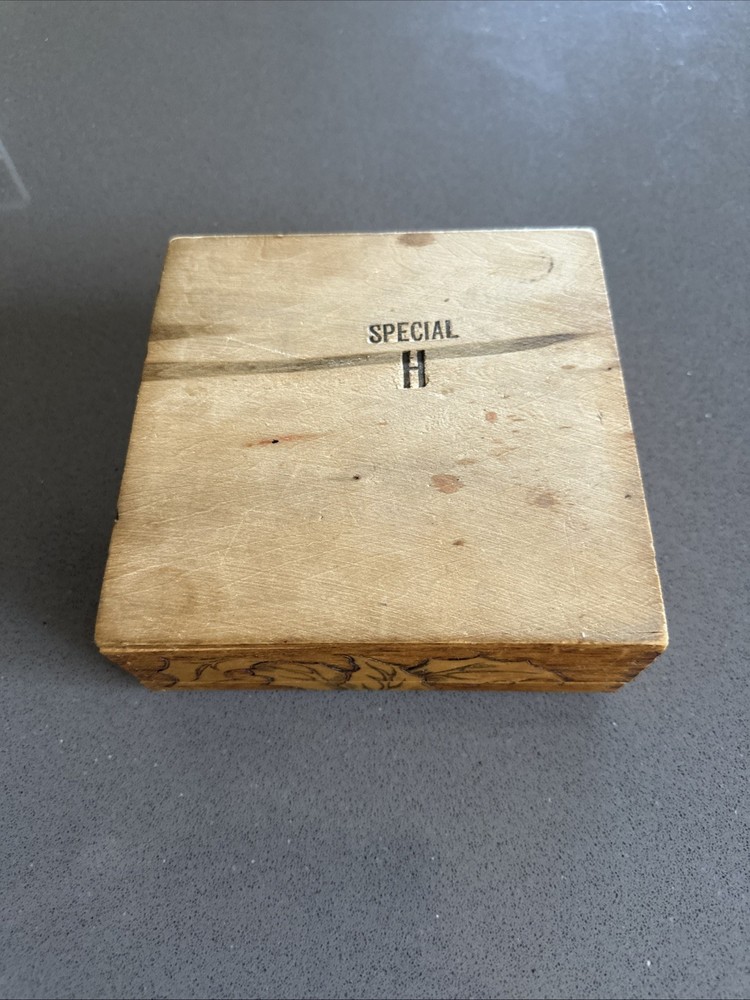 The product is a vintage pyrography burned wood handkerchief vanity box with a hinged lid featuring an art deco ladies face pattern. Made of wood and in a square shape, this unique decorative collectible is suitable for storing glove, hankies,and keepsakes. With a brown color and a natural finish, the box is an original piece from 1940s manufactured in the United States. The special brand "speacial H" adds to its charm, making it a perfect addition to any collection of folk art and wood burnt wooden boxes.