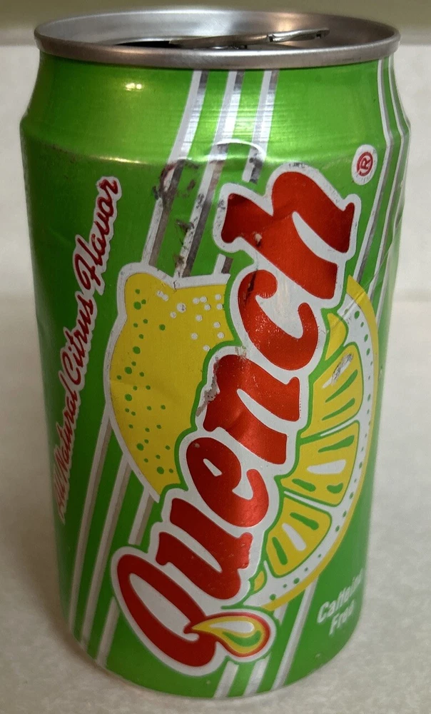 Vintage QUENCH Caffeine Free Citrus Soda 12oz. Empty Pull Tab Aluminum Can. Can shows some wrinkles and wear, please check pics.