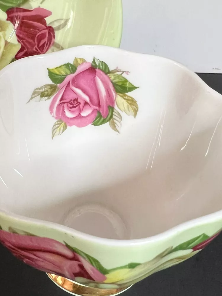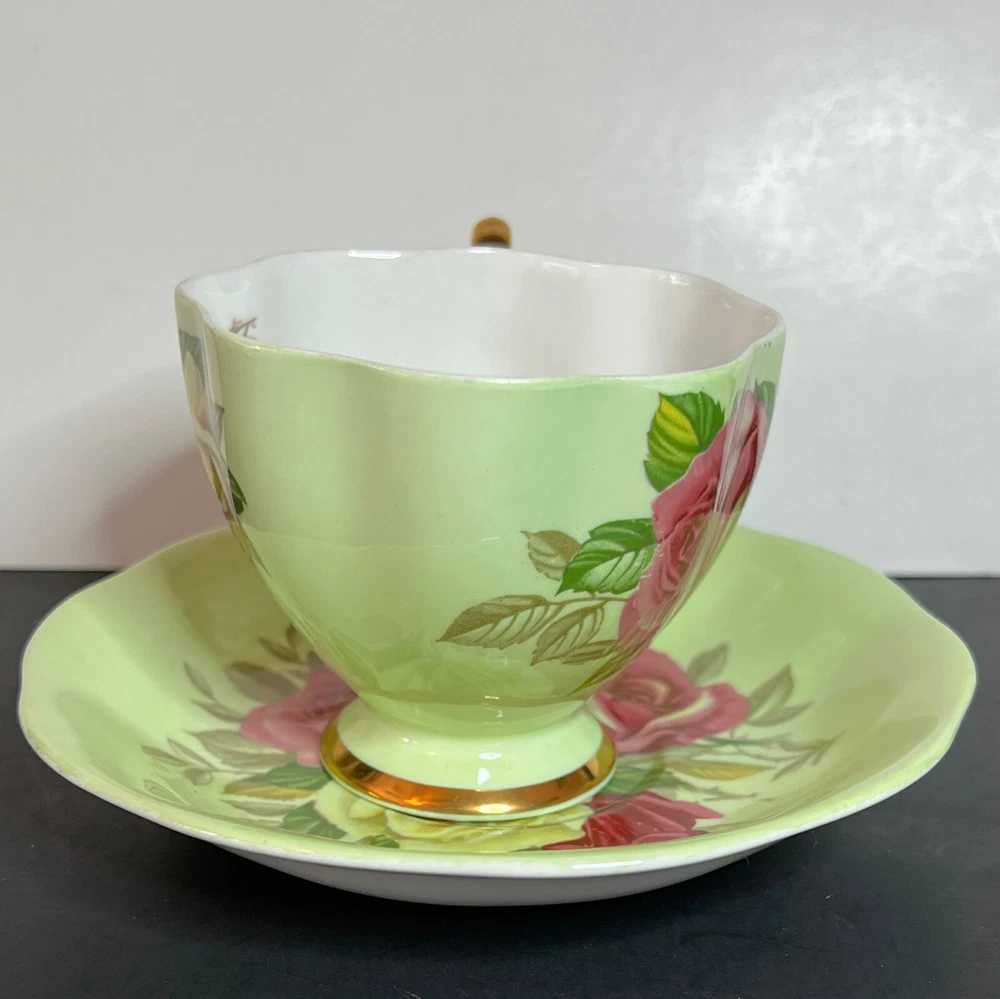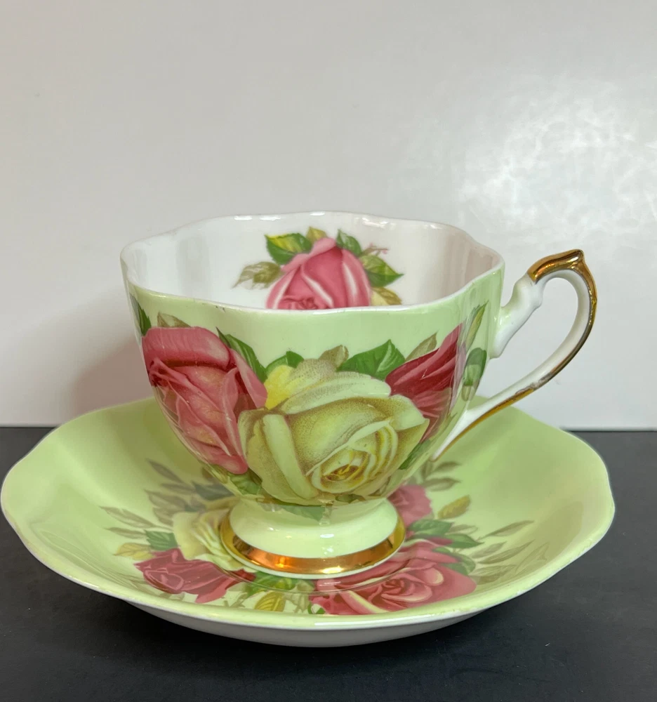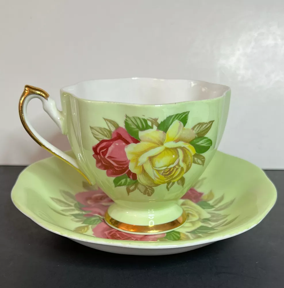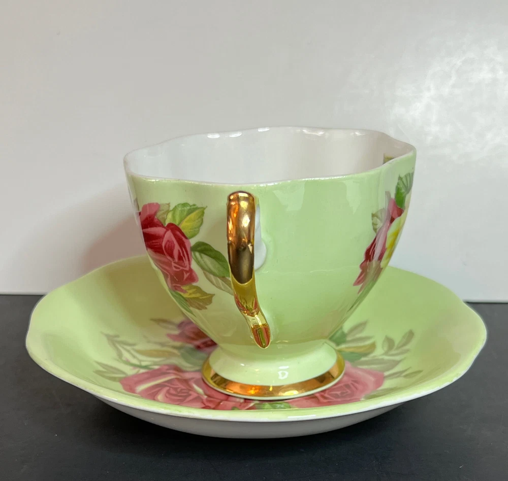 Vintage Queen Anne Yellow and Red Roses on Green Tea Cup and Saucer Set. A beautiful cup and saucer has never been used only on display . The saucer is about 5.75 inches wide and the cup is about 3 inches tall . I will pack it with great care and sent it to you ASAP Thanks for looking