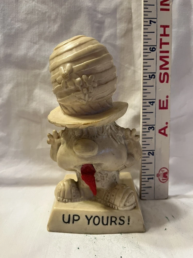 Item Width:3.5"Number in Pack:1Brand:W & R BerriesYear Manufactured:1970Theme:PeopleColor:BeigeCountry/Region of Manufacture:United StatesOccasion:All OccasionsTime Period Manufactured:1970-1979Era:Late 20th Century (1970-1999)Handmade:NoItem Height:6.25"Artist:Russ BerrieSubject:Up YoursType:FigurineItem Weight:15.5 ounces