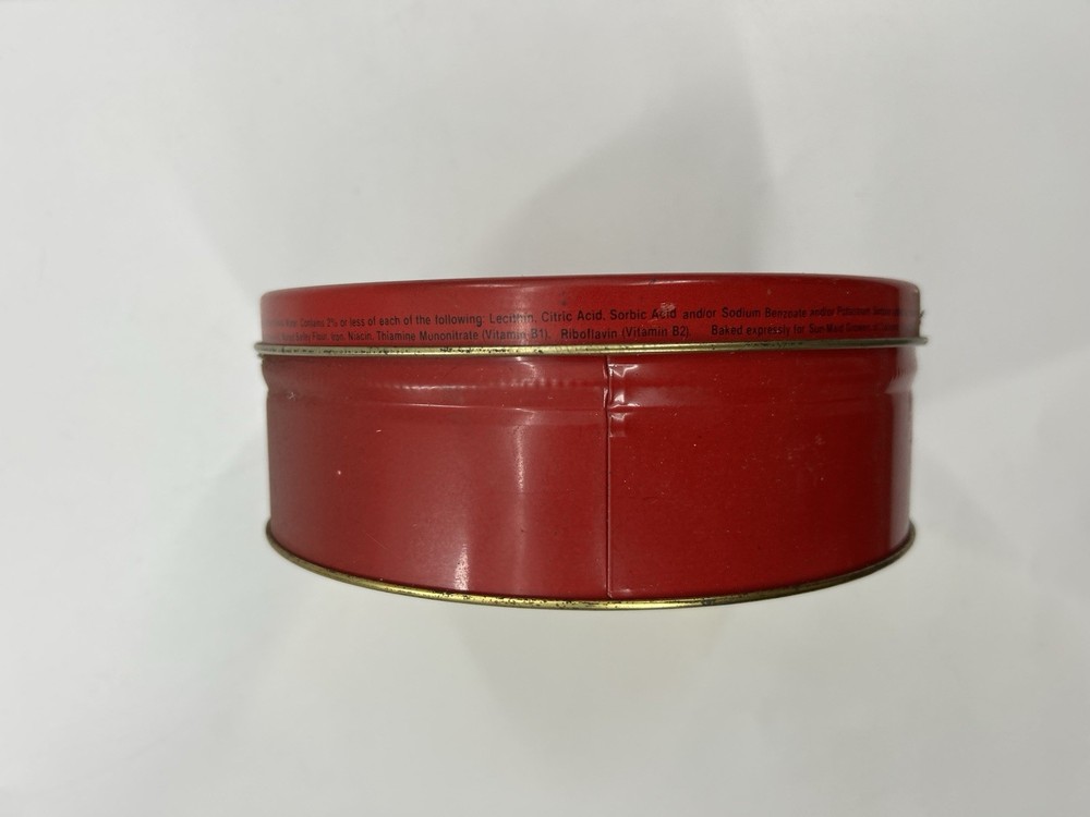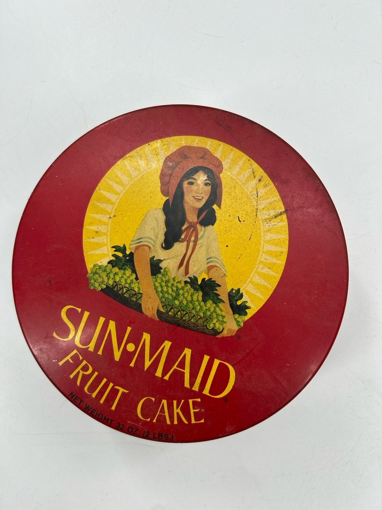 The Vintage RARE Sun Maid Raisins Fruit Cake Round Tin is a unique collectible item featuring a multi-color design with the Sunmaid brand logo. This nostalgic tin likely once held fruit cake that included Sun Maid raisins, making it a rare and sought-after piece for collectors of vintage advertising and merchandise memorabilia. Perfect for adding a touch of nostalgia to any collection, this tin is a special find for fans of classic brands and unique vintage items.