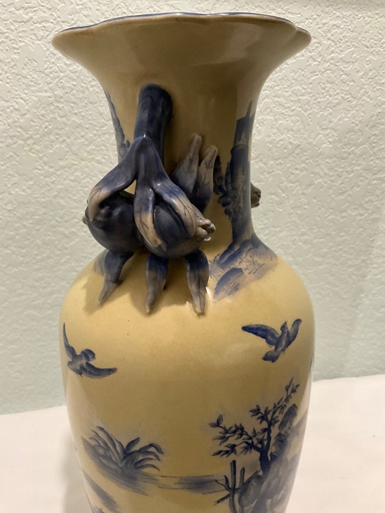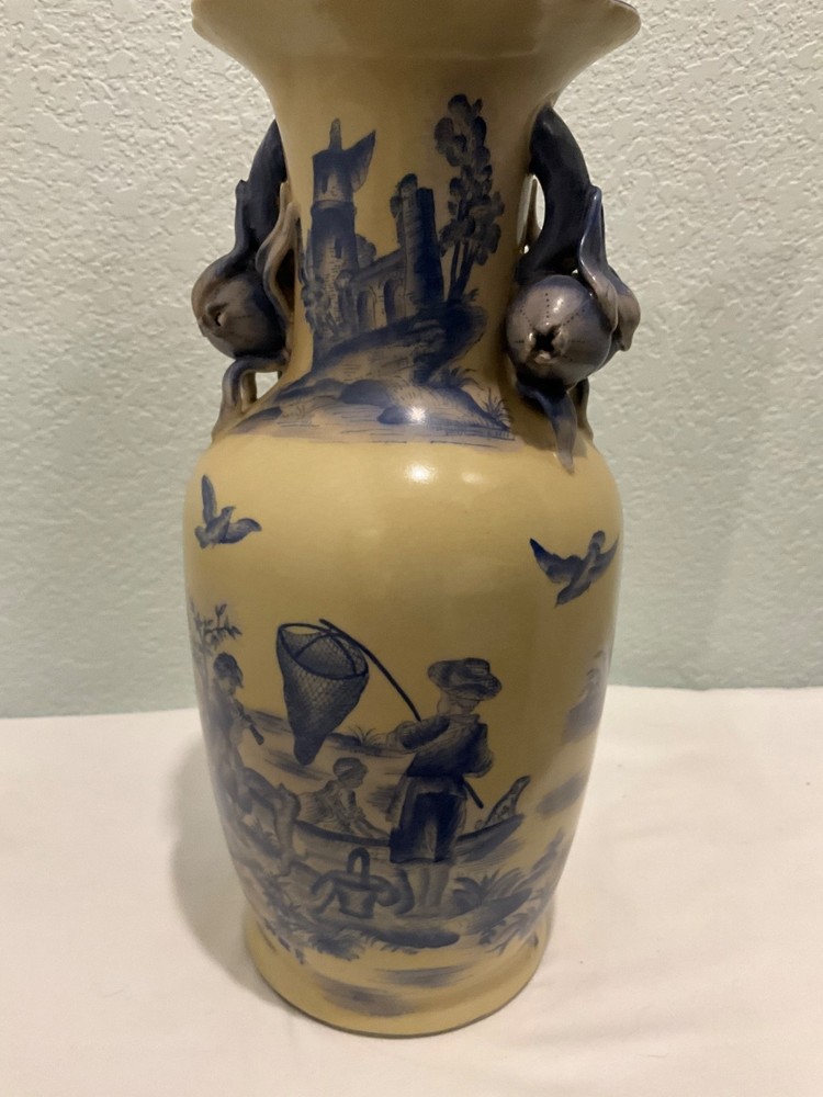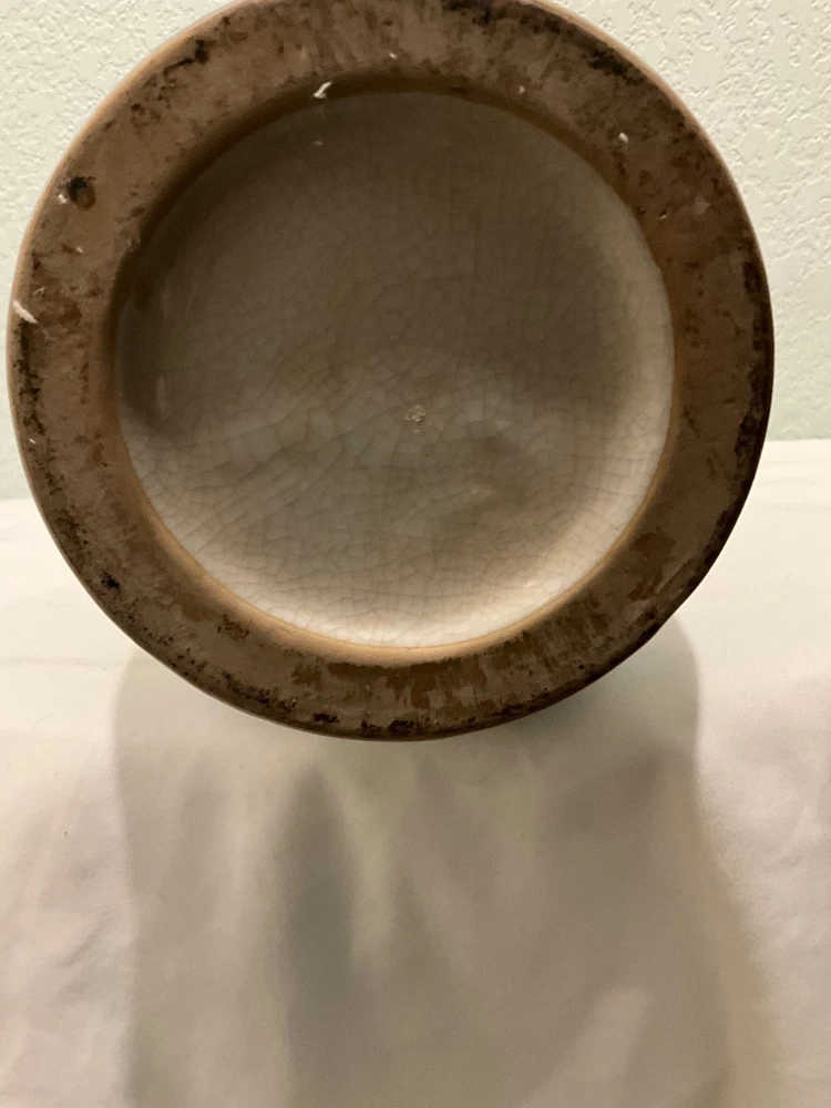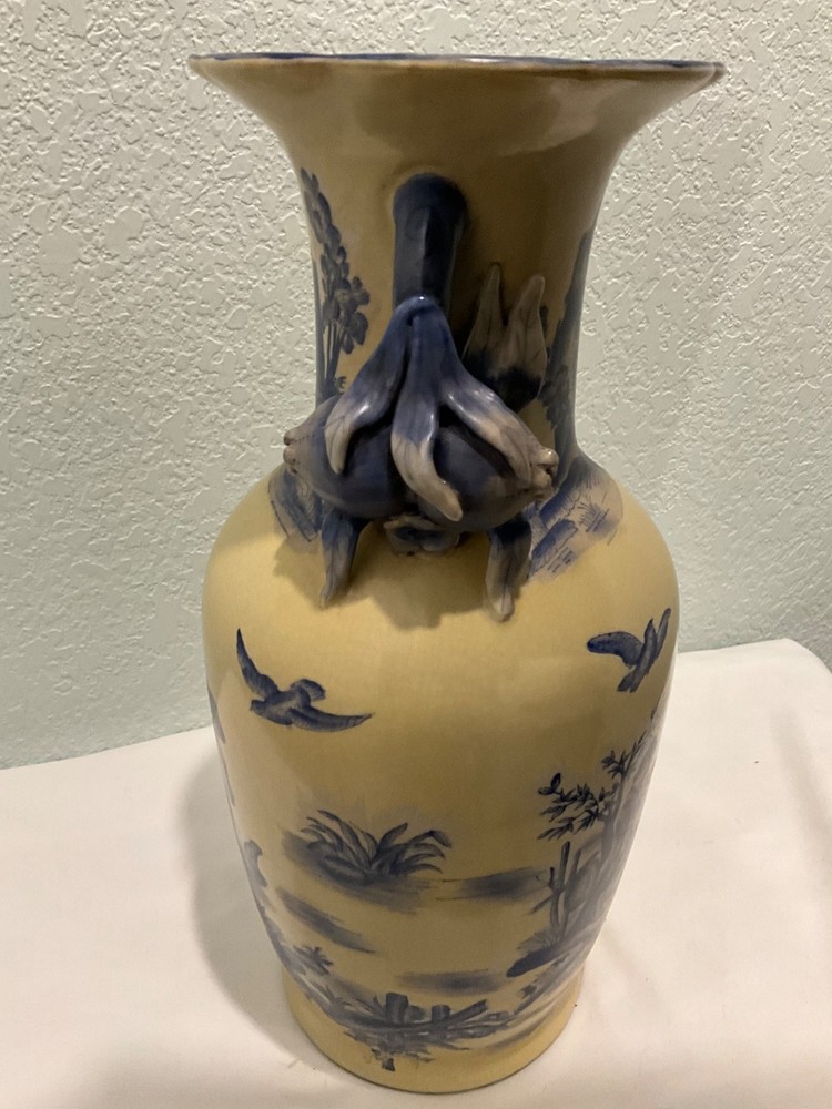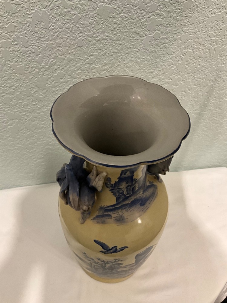 This vintage vase is a rare find, featuring a unique ivory and blue color combination with crackle finish and handles in the shape of flower buds. Really unusual- I have never seen another like it. Standing at 14" tall and 7" wide, it adds a touch of elegance to any space. Perfect for collectors or those looking to add a unique piece to their home decor, this vase is sure to be a conversation starter with its distinctive design. There looks to be slightly raised lettering on the bottom but I couldn’t make it out. Truly a striking piece!