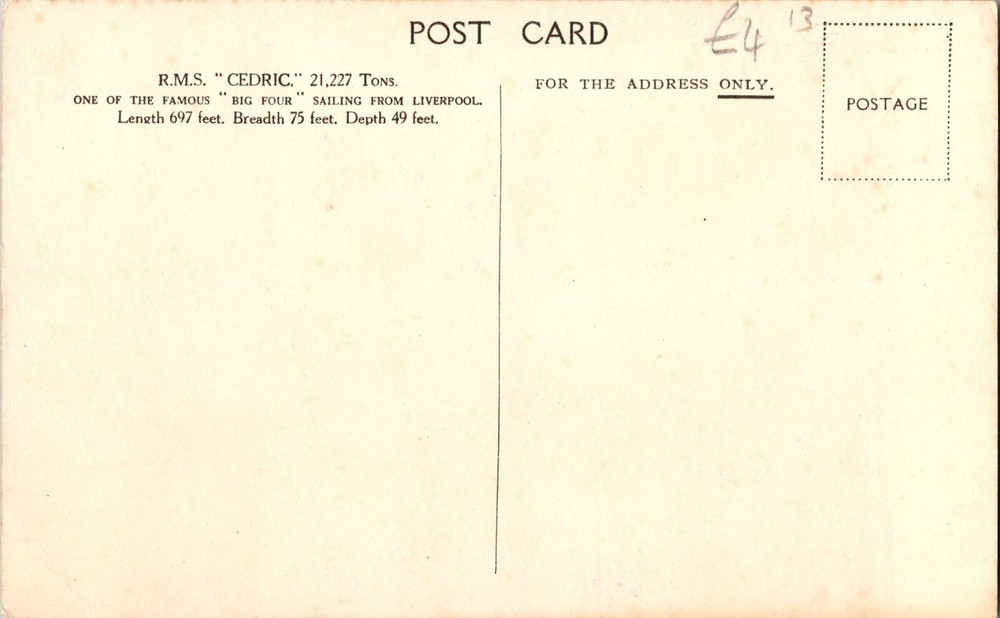 Vintage RMS Cedric White Star Line Twin Screw England Ship Postcard Mint
