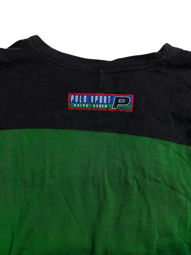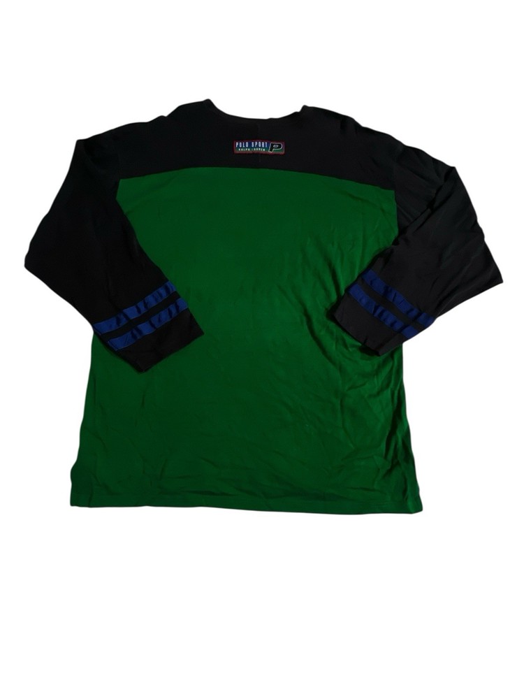 Vintage Ralph Lauren Polo Sport Jersey Size XL Long Sleeve Spell Out Green Blue. Very good pre-owned vintage condition. No holes, rips or stains; see pictures for measurements. We pre-wrap and inventory right after pictures, therefore no more measurements can be given. G100