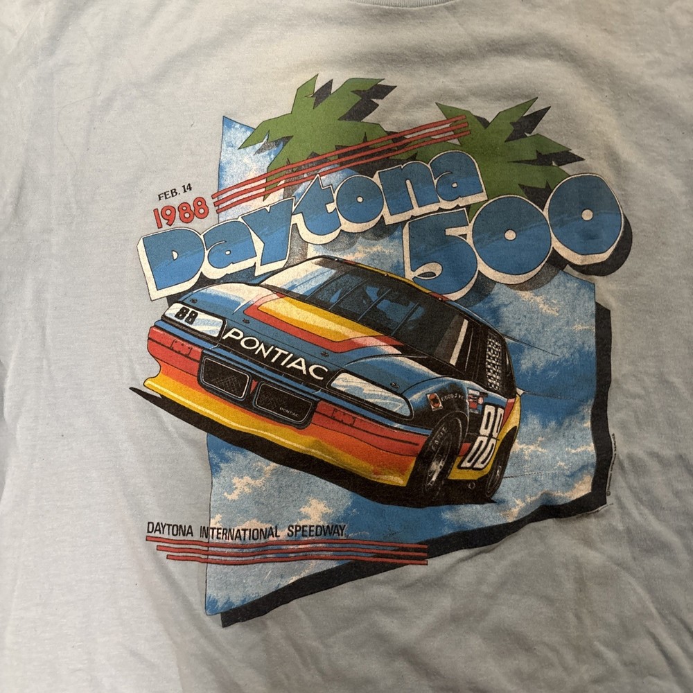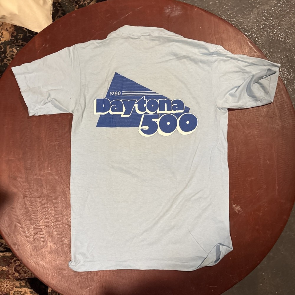 This product is a rare vintage 1988 Daytona 500 NASCAR double-sided graphic t-shirt in size large. The shirt is made of cotton and features a sportswear/beach look, perfect for fans of retro racing memorabilia. Produced by the brand Anvil in the 1980s, this shirt is a unique piece of American-made apparel that would make a great addition to any vintage clothing collection or a perfect gift for a NASCAR enthusiast. 9/15/25