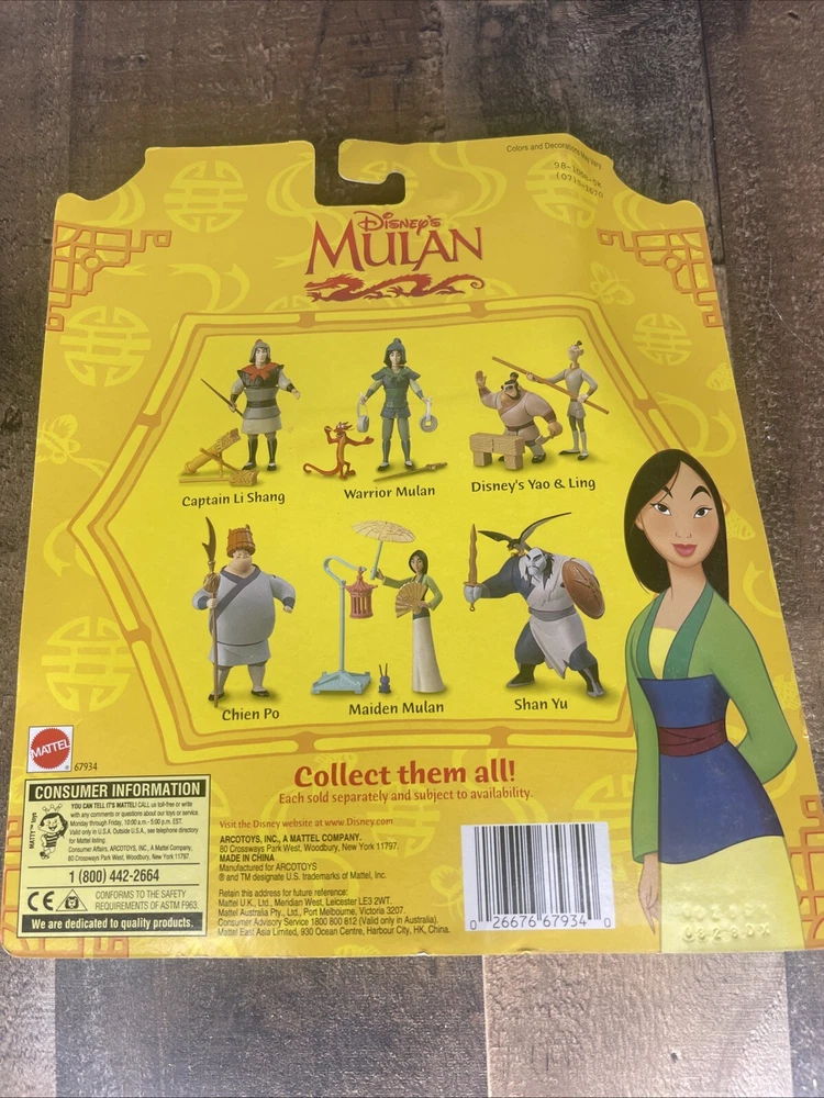 Brand: Mattel Character Family: Mulan Franchise: Disney Type: Action Figure Movie: Mulan gtin13: 026676679340 Material: Plastic UPC: 026676679340 Year Manufactured: 1997 Year: 1997 Character: Mulan Packaging: Original (Unopened)