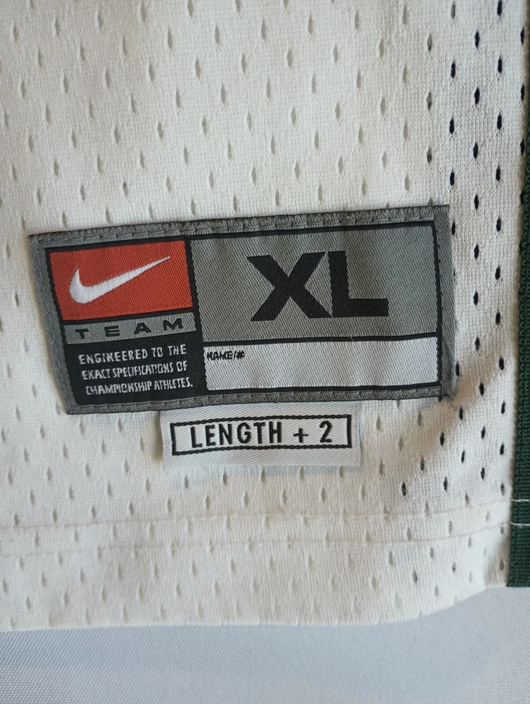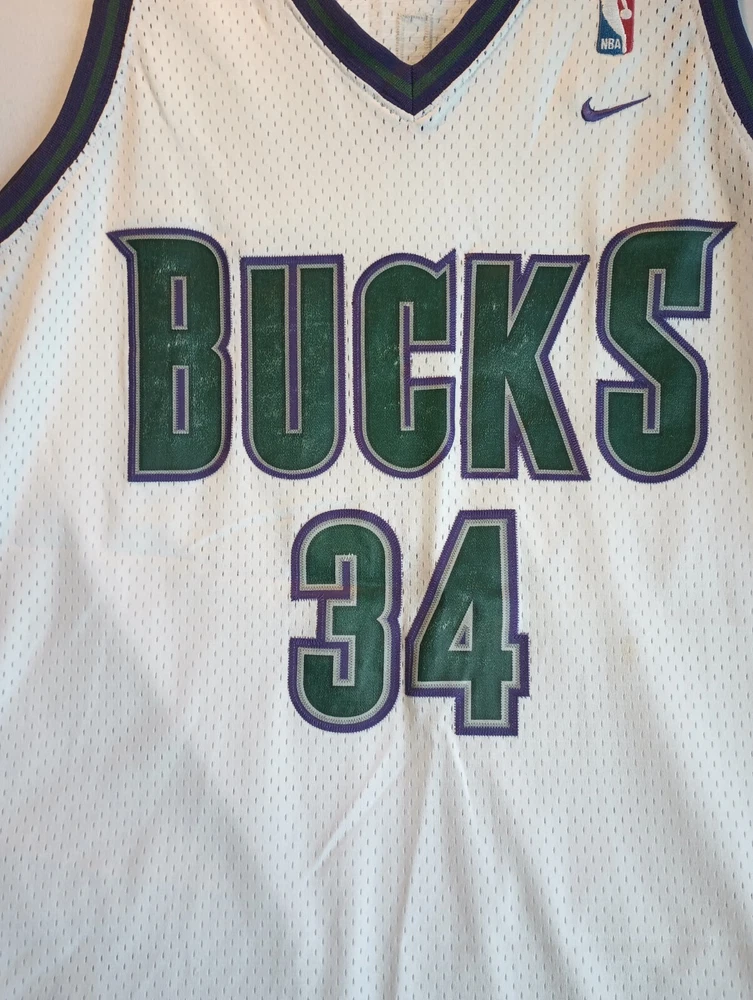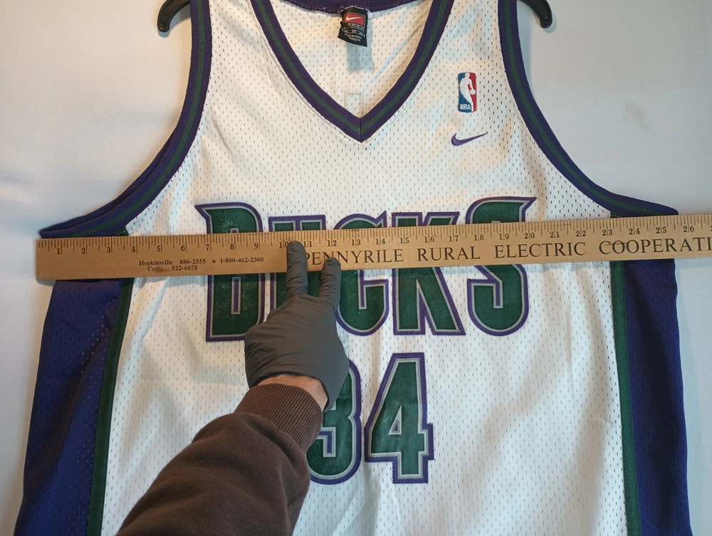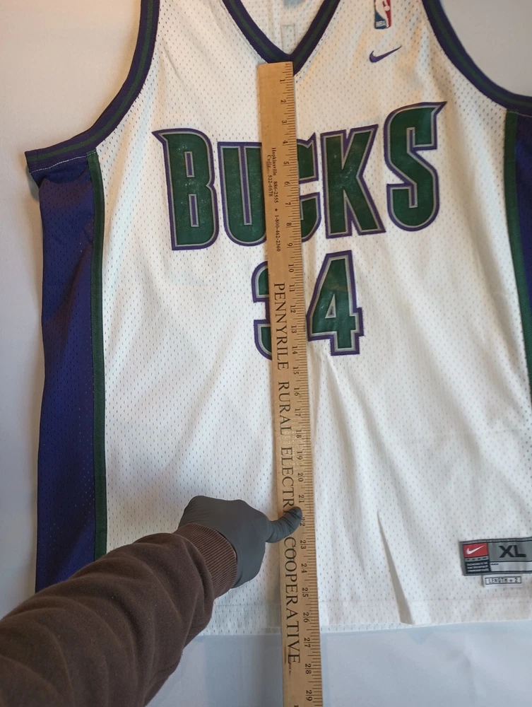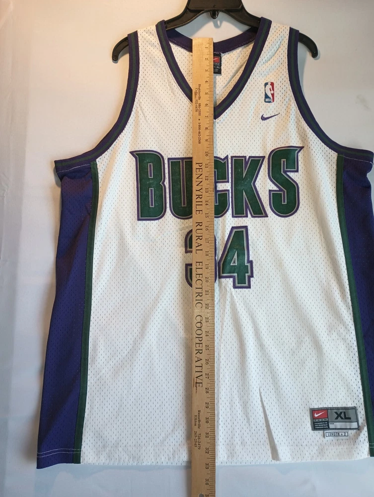 Show your love for the Milwaukee Bucks with this vintage Ray Allen #34 jersey. Made by Nike, this officially licensed product is perfect for basketball fans of all ages. The white jersey features the team's colors and logo, and is made of high-quality materials for maximum comfort and durability. This XL jersey is designed for men and is perfect for regular season games. It's a must-have for any fan of the National Basketball Association (NBA) and the Milwaukee Bucks. Get yours today and wear it proudly to the next game!