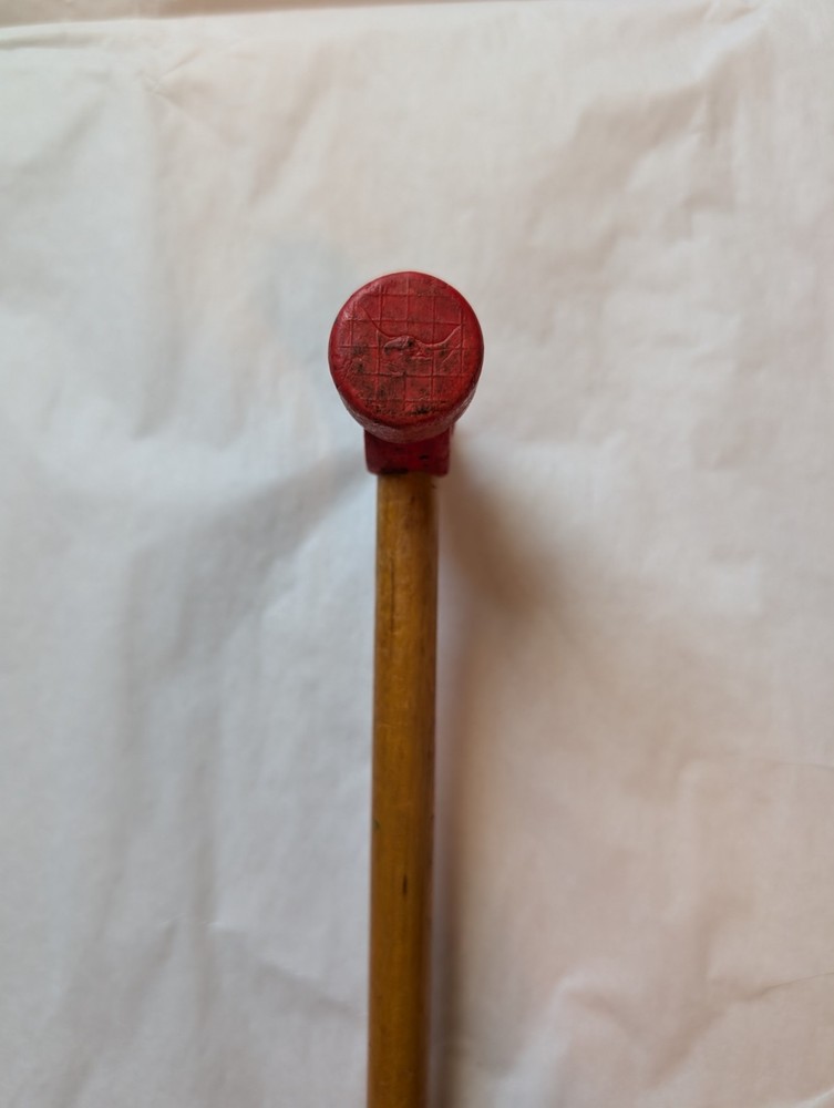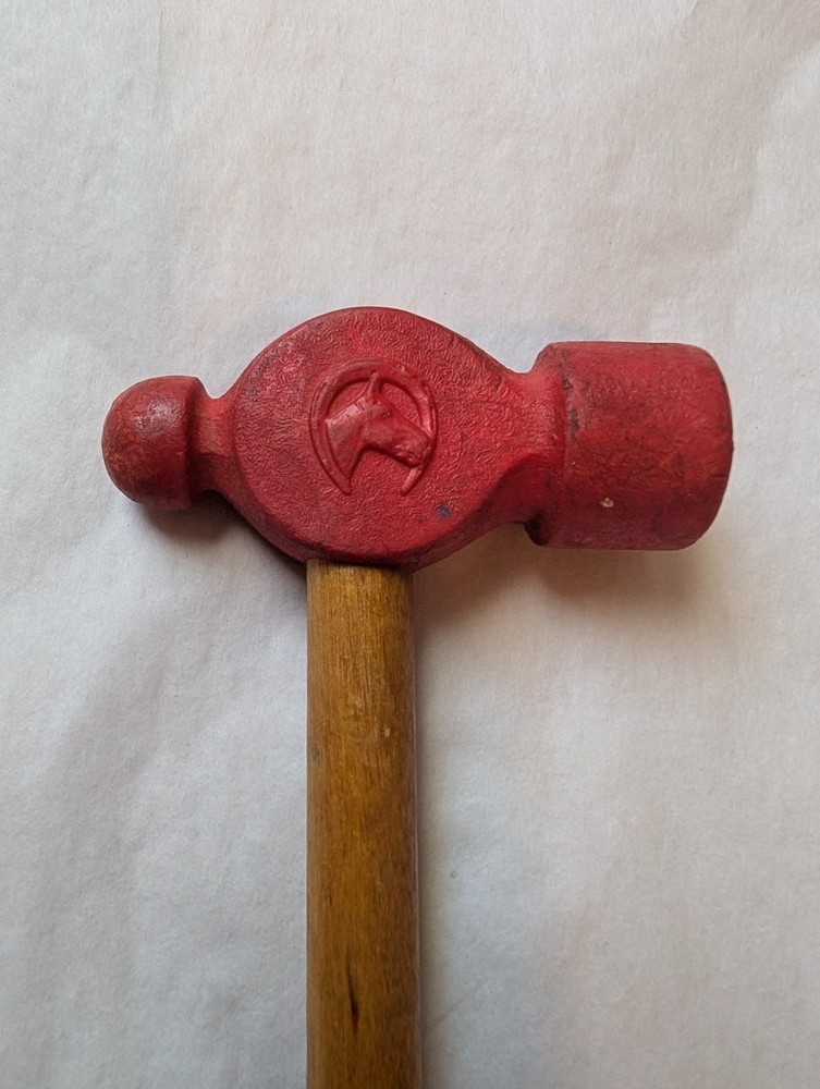 Vintage Auburn Rubber Toy Red Ball Peen Hammer with Wooden Handle This is a toy ball peen hammer The head is red rubber with a horse head and horse shoe design on it The handle is made of wood The hammer is 9.5 inches in length Used, see pictures for condition Ships via USPS