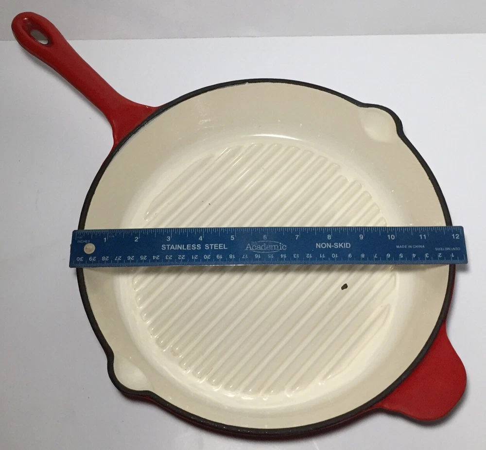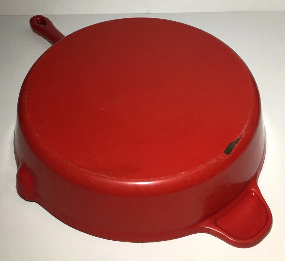 Vintage Red Enameled Ribbed 12” Cast Iron Spouted Skillet. The skillet has a few flakes in the enamel. Other than the flakes it’s in overall good condition. Please feel free to ask any questions. The item will ship out safely and securely the same or next business day.