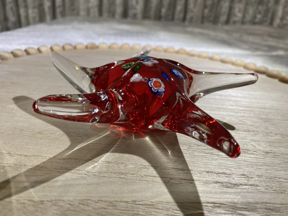This item is a vintage starfish figurine, acquired in the early 2000's. Specifically, it is a Millefiori-style, glass starfish in clear and red, with multicolor flowers. "Millefiori" translates from Italian to "thousand flowers", and refers to the Murrina technique of slicing canes of glass to expose transverse patterns. In Millefiori, the slices of layered glass exposes a flowerlike design. Measurements Height: 2 in Width / Length (at widest / longest point): 6.325 in Weight: 13.8 oz These measurements are Seller's best approximations. Vintage. Pre-owned and in excellent condition. No flaws observed. Please see all photos. SHIPPING: All items will be weighed, photographed and/or video-recorded while item is prepared for shipment. Shipping of items will always prioritize the care and safety of the item, but at times will use recyclable materials (to include boxes and packaging materials). DISCLAIMER: All photographs provided do not use filters with any intent to alter or improve the appearance or condition of the item. All items are inspected carefully and flaws are photographed and presented as transparently as possible to The Buyer. All measurements provided are done to the best of the ability by The Seller. If you have any further questions pertaining to the description of this item, please contact The Seller BEFORE purchasing or placing an offer.