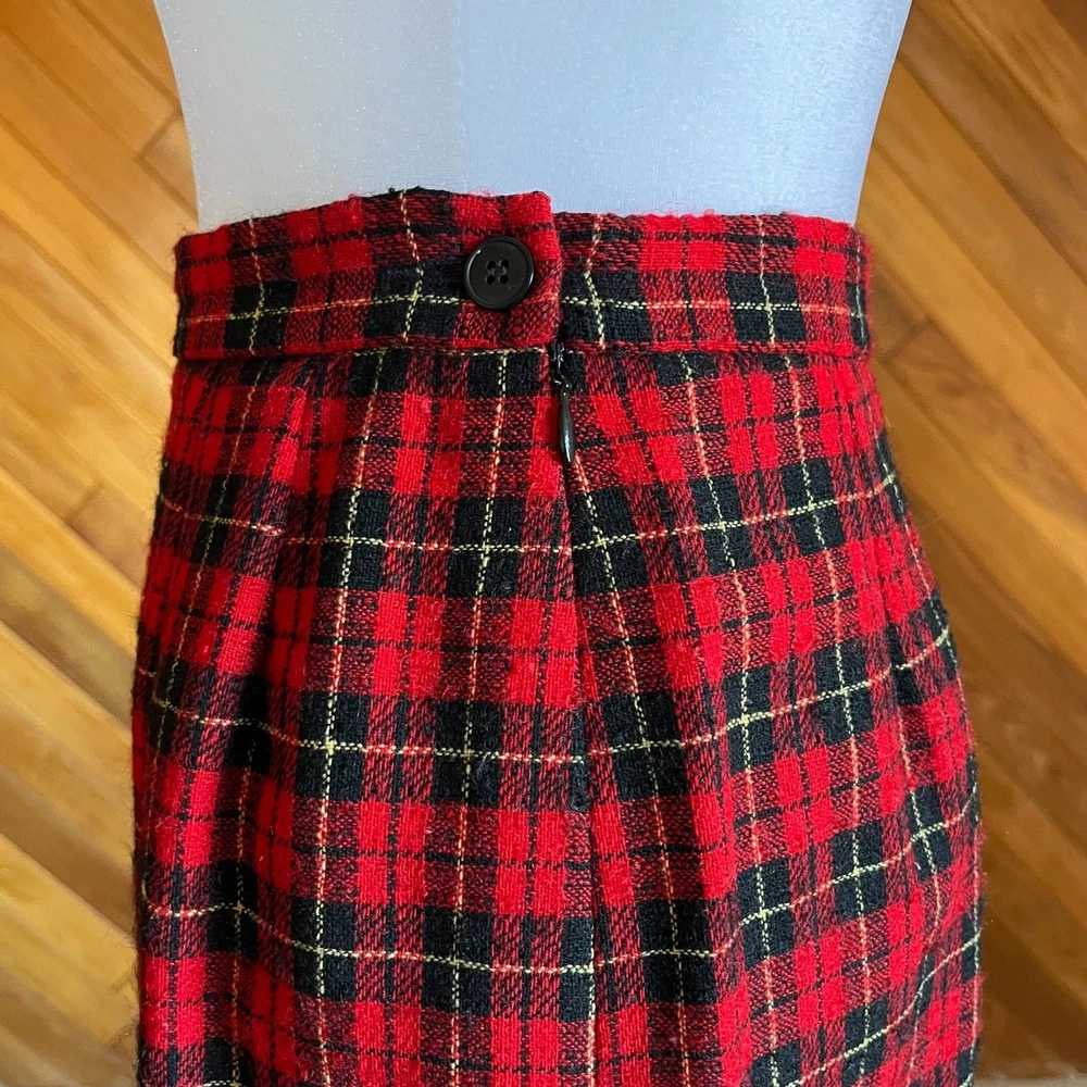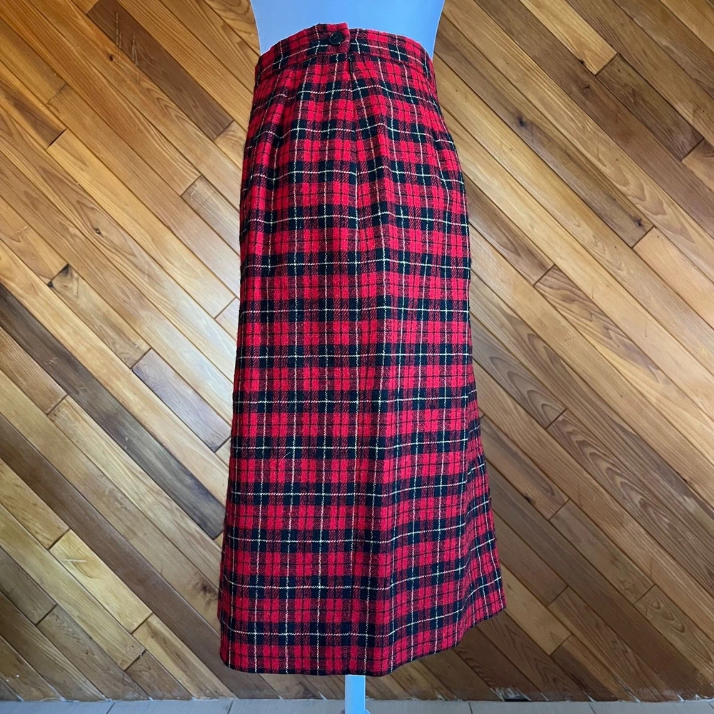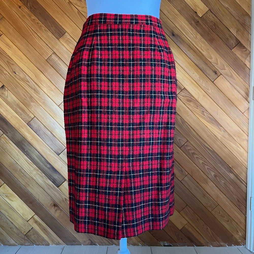 Classic red and black plaid pencil skirt is a staple piece for your closet that will never go out of style. Subtle yellow stripes set this apart from buffalo plaid and make it less casual. Fully lined. Side closure with zip ans button. Condition: Excellent Flaws: None Brand: Pendleton Materials: Wool Please review measurements before purchasing and feel free to ask any questions. All sales are final. Open to reasonable offers. Measurements taken while flat: Waist: 28 Hips: 40 Length: 24 Labeled a 10 - fits more like a 4/6