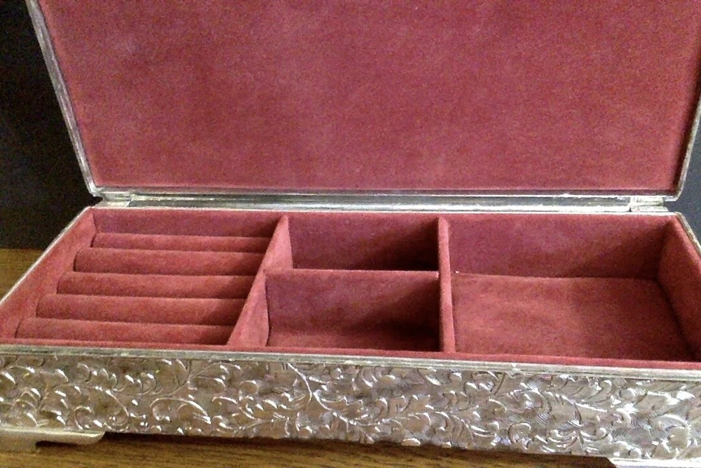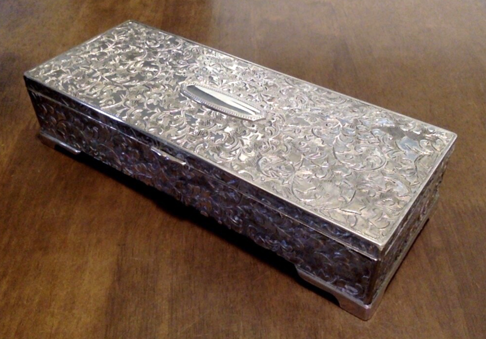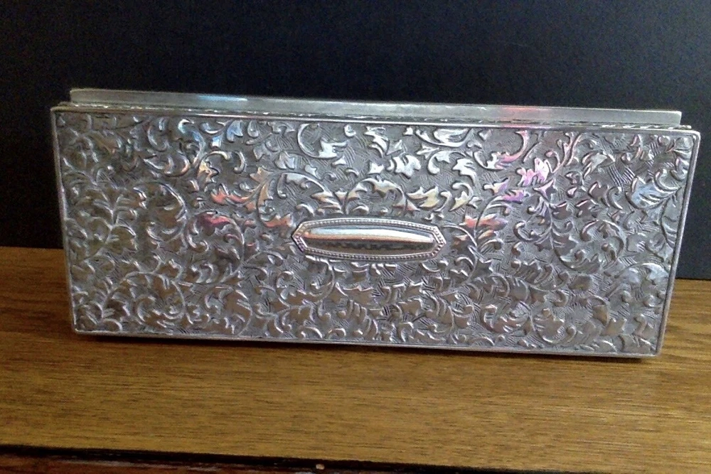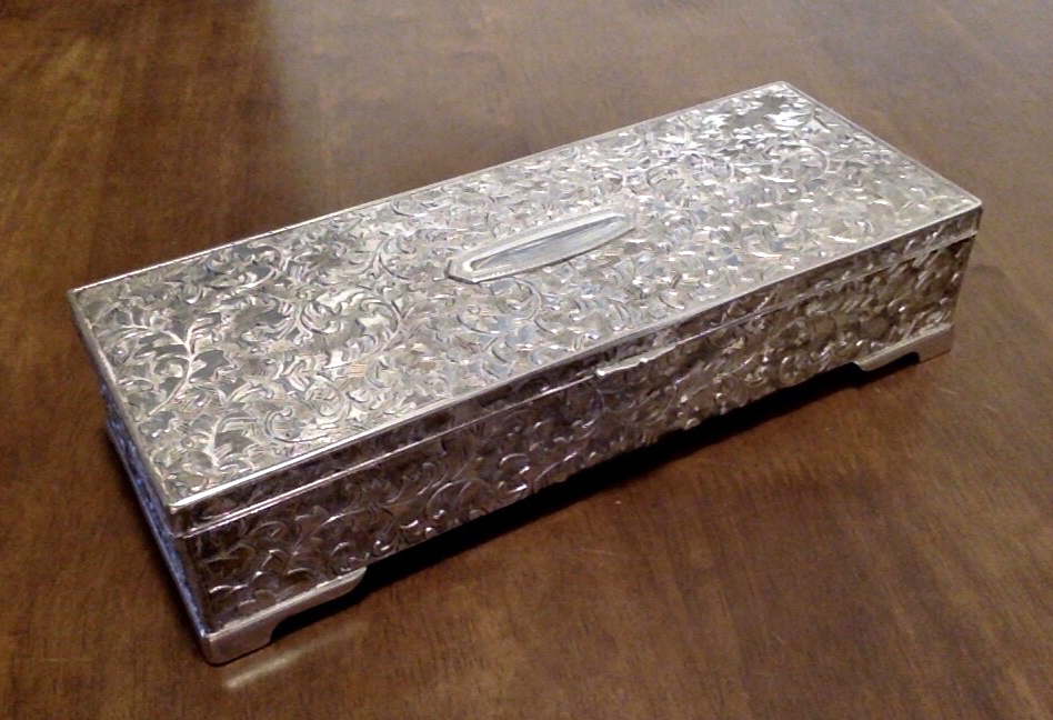 Excellent vintage condition (circa 1990s) lid opens and closes smoothly, Beautiful red velvet interior, ornate silver plated exterior. Made by Godinger, this box has a plaque area in the center of the lid surface decoration that may be engraved with your initials. Ships via UPS ground, carefully packed. Thanks for looking, and enjoy!