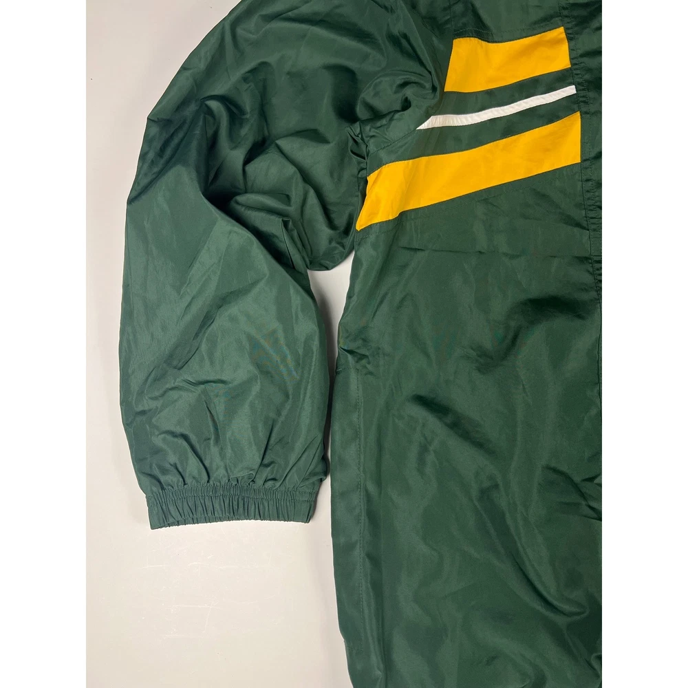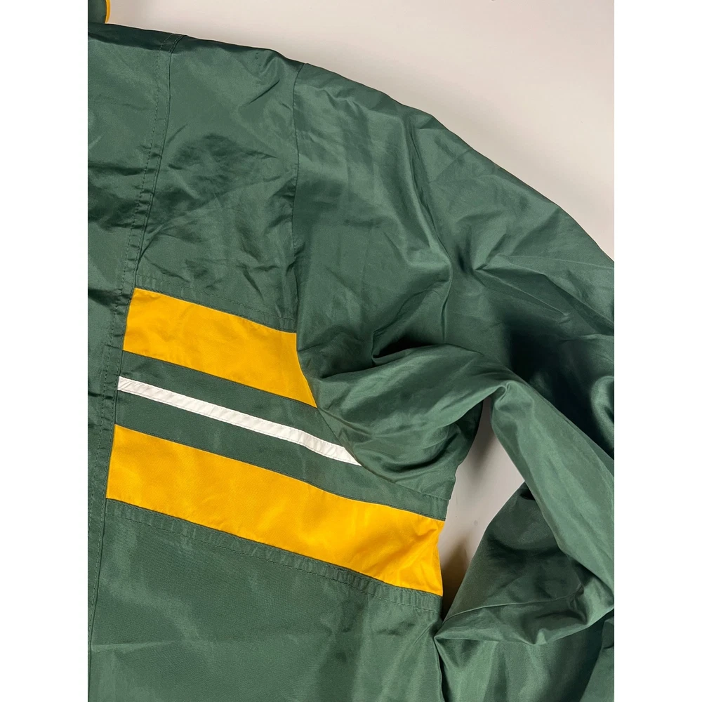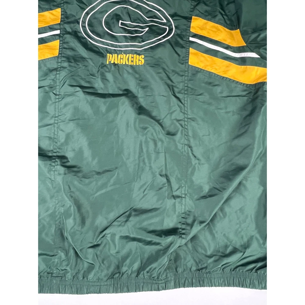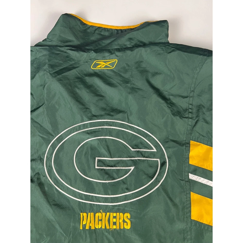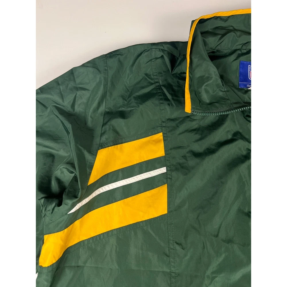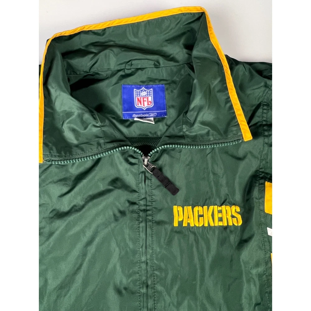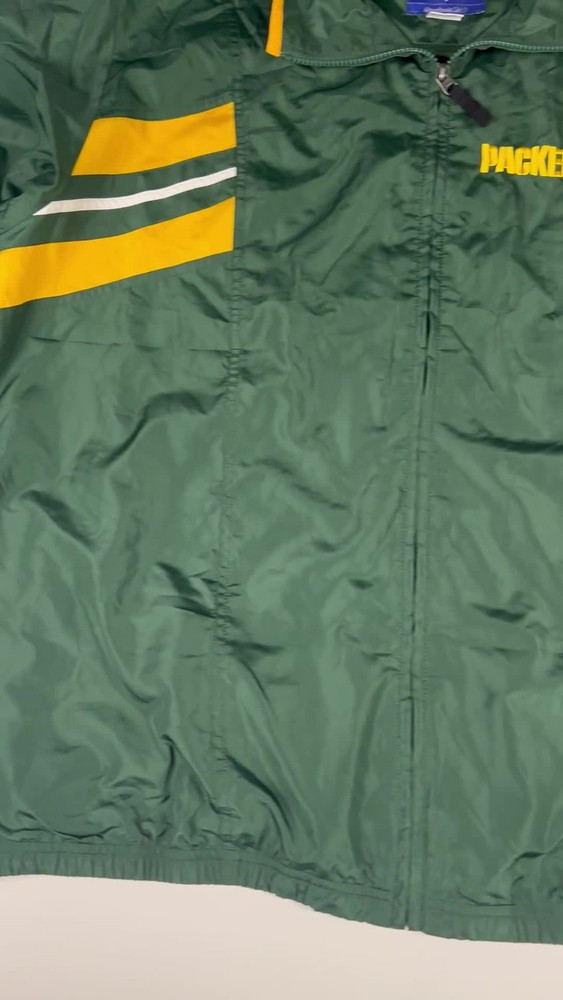 Elevate your game day look with this vintage Green Bay Packers windbreaker. This classic piece features the iconic Packers colors and logo, making a bold statement of team pride. From the spirited chest embroidery to the sporty shoulder stripes, every detail embodies the energy and excitement of Lambeau Field. Perfect for layering on cool autumn evenings or showcasing your team spirit at tailgates, this windbreaker will be your go-to for showing your love of the Green and Gold. Its lightweight construction makes it ideal for active outdoor pursuits like hiking or casual strolls around town. Embrace the spirit of the game with this timeless piece. Type: Jacket Style: Windbreaker Outer Shell Material: Polyester Department: Men Color: Green Lining Material: Nylon Insulation Material: Polyester Features: Wind-Resistant, Collared, Lined, Lightweight, Packable Accents: Logo, Embroidered, Zipper Pattern: Striped Model: Reebok NFL Windbreaker Keywords: Reebok, NFL, Green Bay Packers, Windbreaker, Jacket, Vintage, Retro, 90s, Sports, Football, Team Apparel, Green, Yellow, XL, Mens