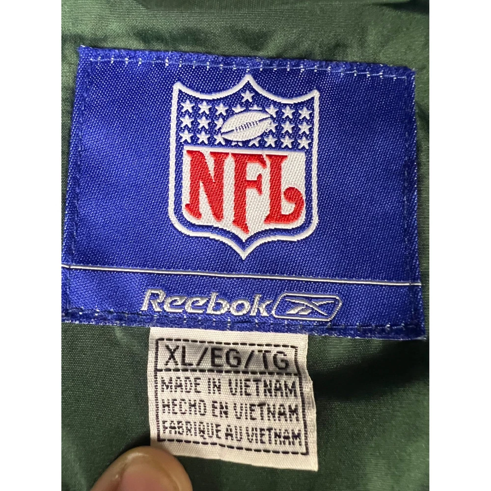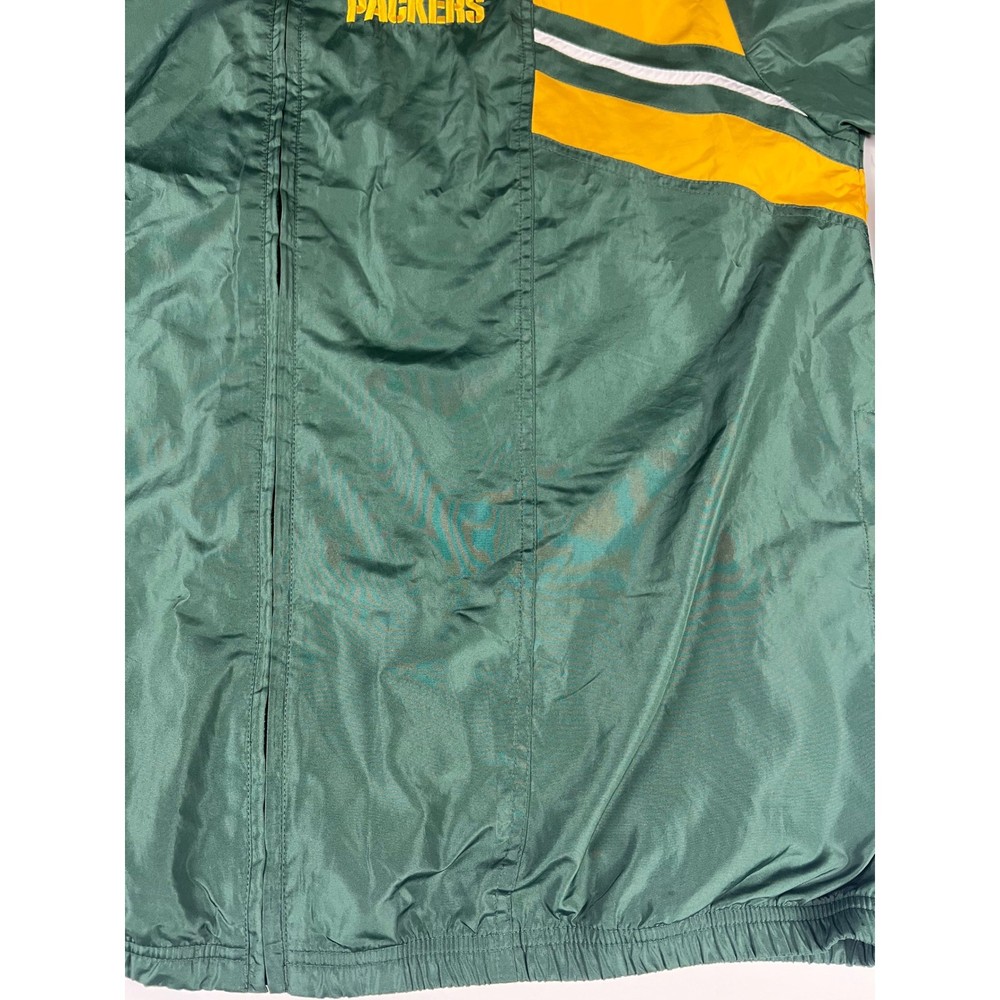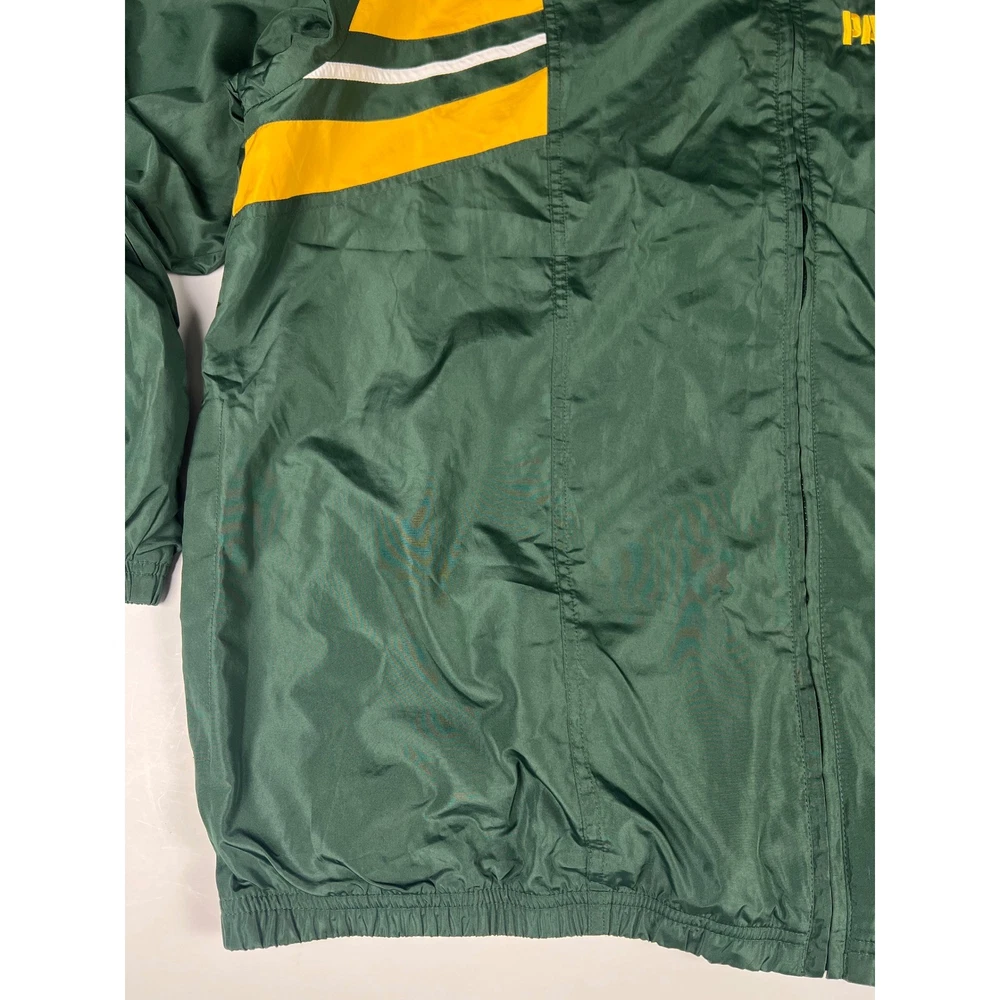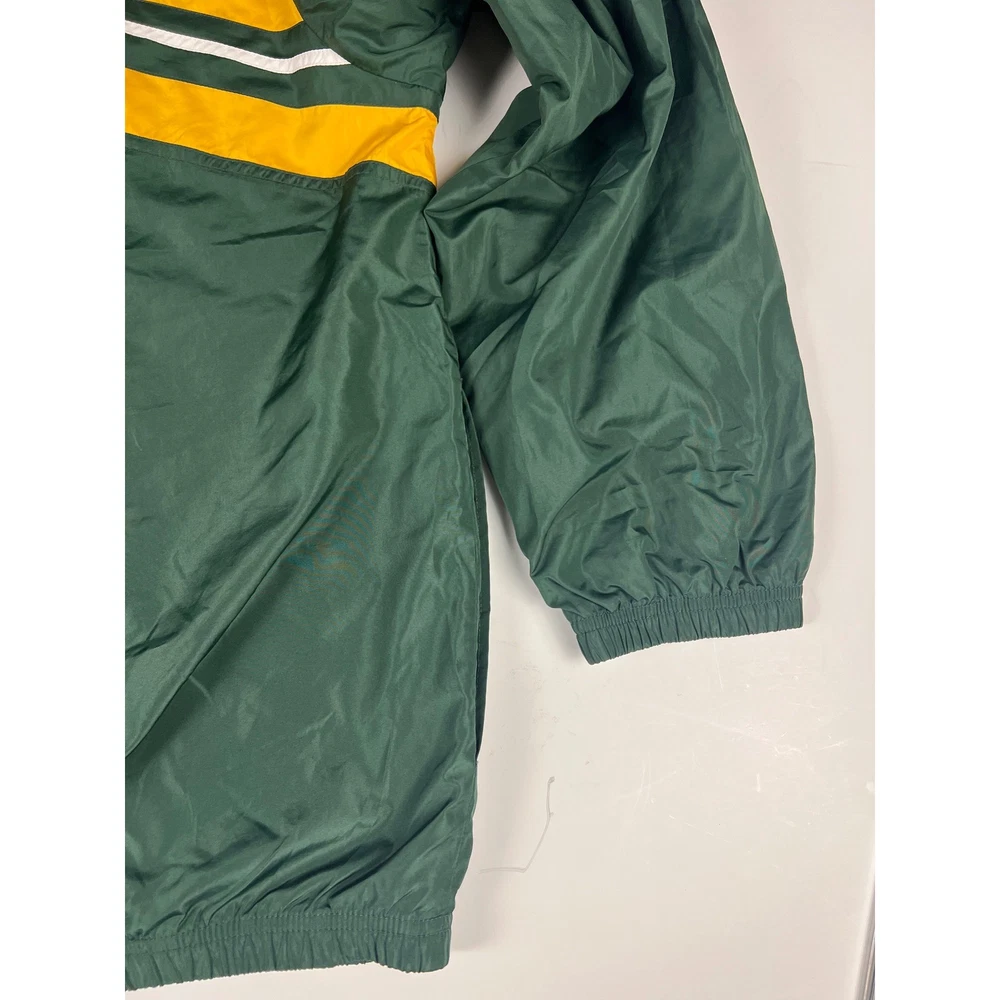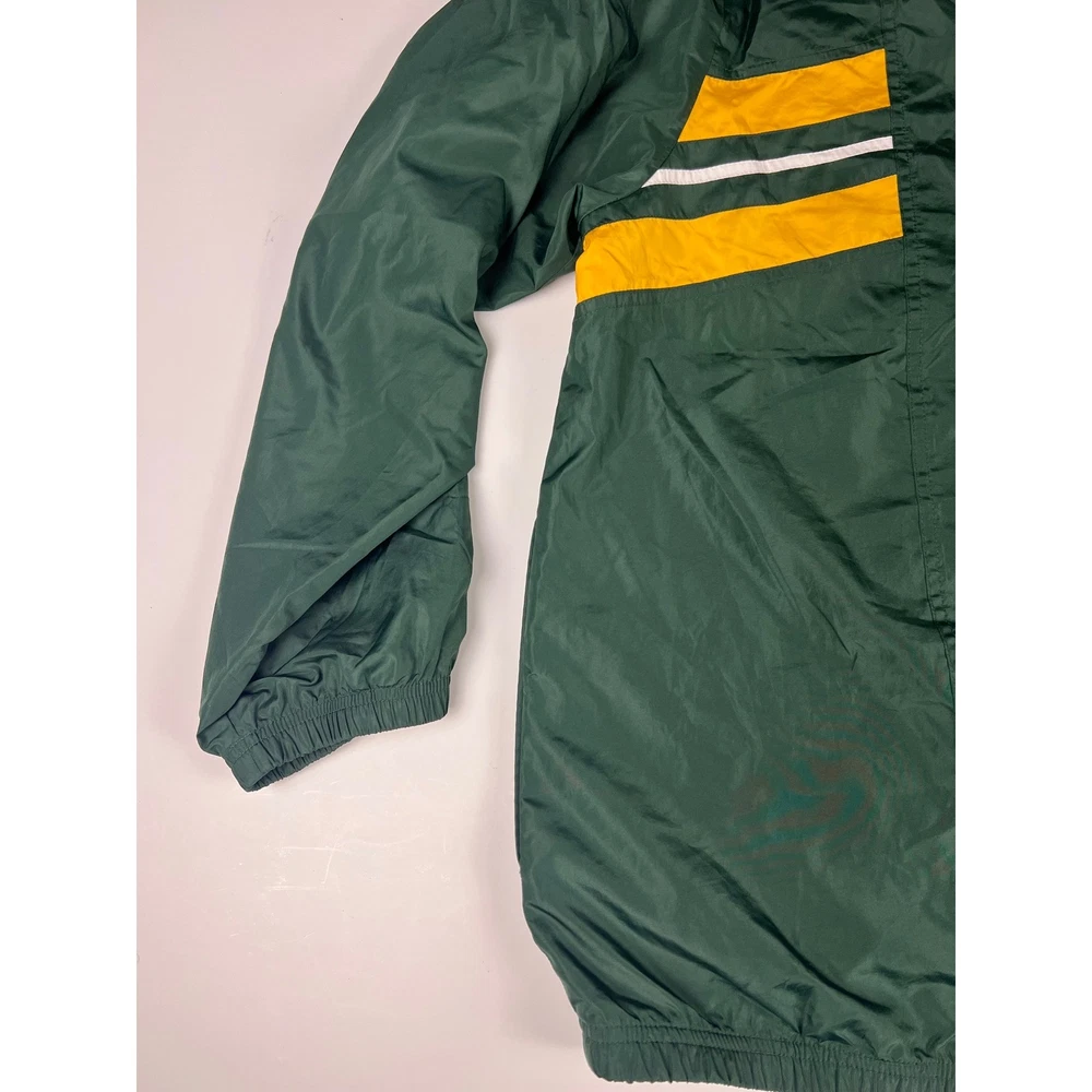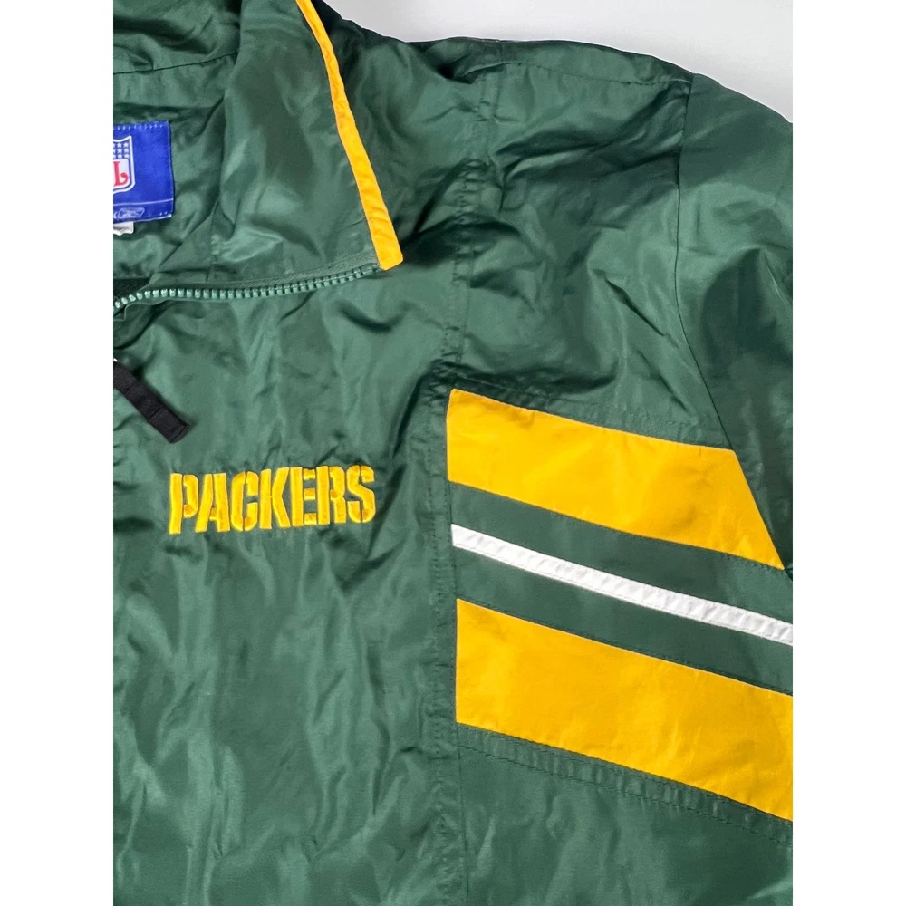 Elevate your game day look with this vintage Green Bay Packers windbreaker. This classic piece features the iconic Packers colors and logo, making a bold statement of team pride. From the spirited chest embroidery to the sporty shoulder stripes, every detail embodies the energy and excitement of Lambeau Field. Perfect for layering on cool autumn evenings or showcasing your team spirit at tailgates, this windbreaker will be your go-to for showing your love of the Green and Gold. Its lightweight construction makes it ideal for active outdoor pursuits like hiking or casual strolls around town. Embrace the spirit of the game with this timeless piece. Type: Jacket Style: Windbreaker Outer Shell Material: Polyester Department: Men Color: Green Lining Material: Nylon Insulation Material: Polyester Features: Wind-Resistant, Collared, Lined, Lightweight, Packable Accents: Logo, Embroidered, Zipper Pattern: Striped Model: Reebok NFL Windbreaker Keywords: Reebok, NFL, Green Bay Packers, Windbreaker, Jacket, Vintage, Retro, 90s, Sports, Football, Team Apparel, Green, Yellow, XL, Mens