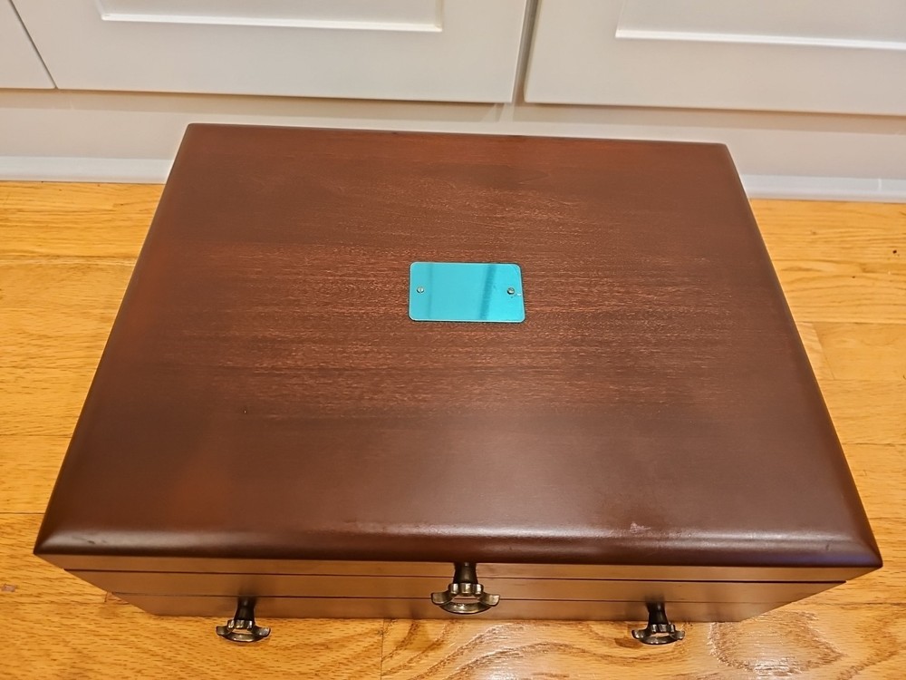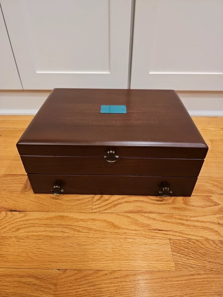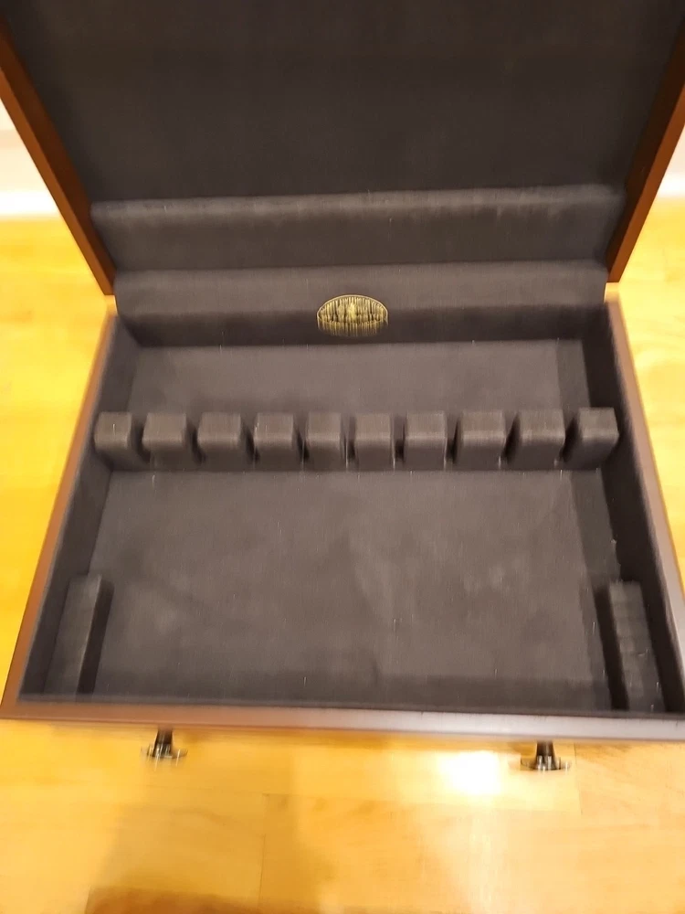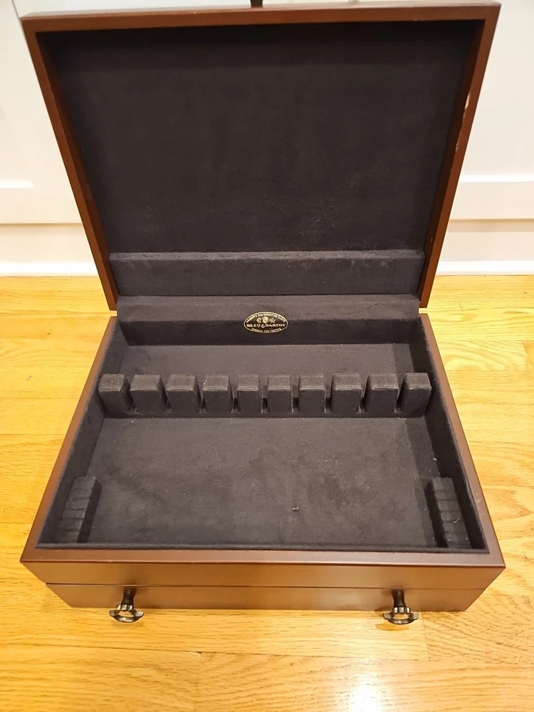 Reed & Barton Wooden Silverware case with a drawer. Very nice condition. Some scratches from use. A few tiny dents in the wood on the cover. Name plate on cover has never been etched and still has the protective plastic. Great side and drawer handles. Clean inside. Measures 14 3/4"" long x 6" high x 11 1/4" wide. A great redish brown wood.(maybe cherry, but not sure). Made by eureka mfg. Holds a service for 12. 12 knife slots on the cover.