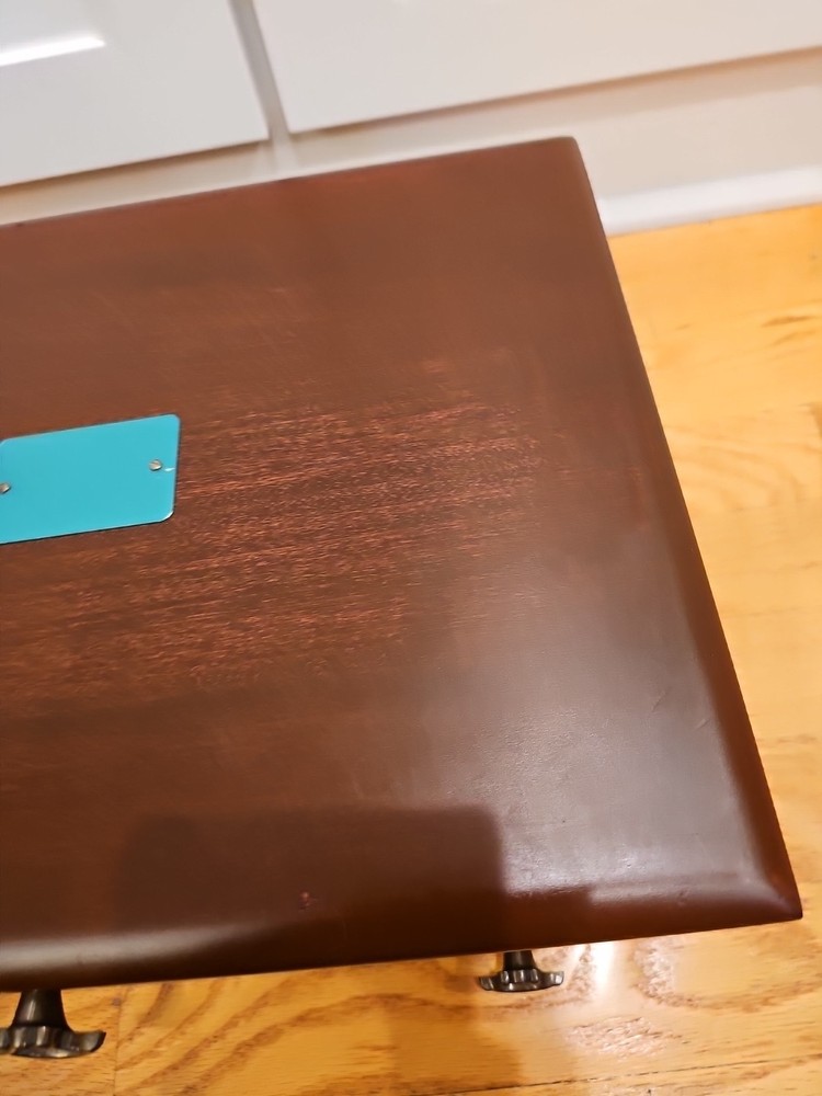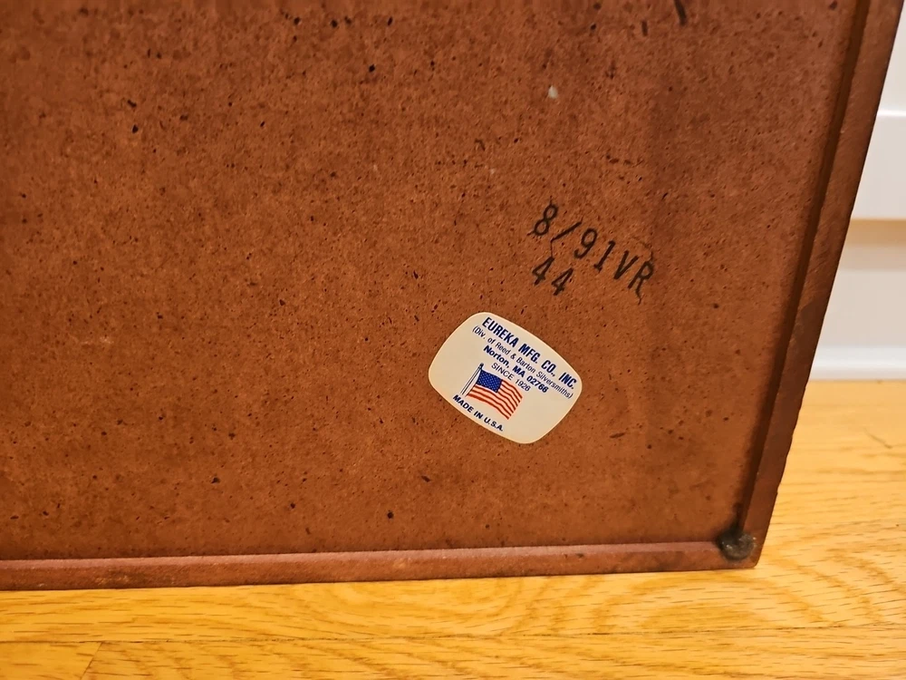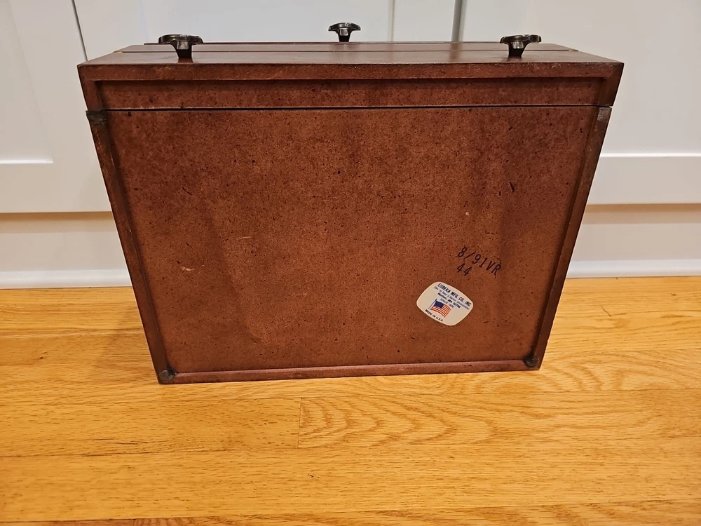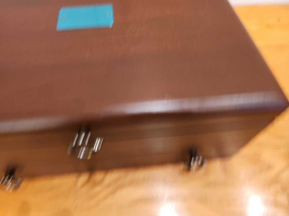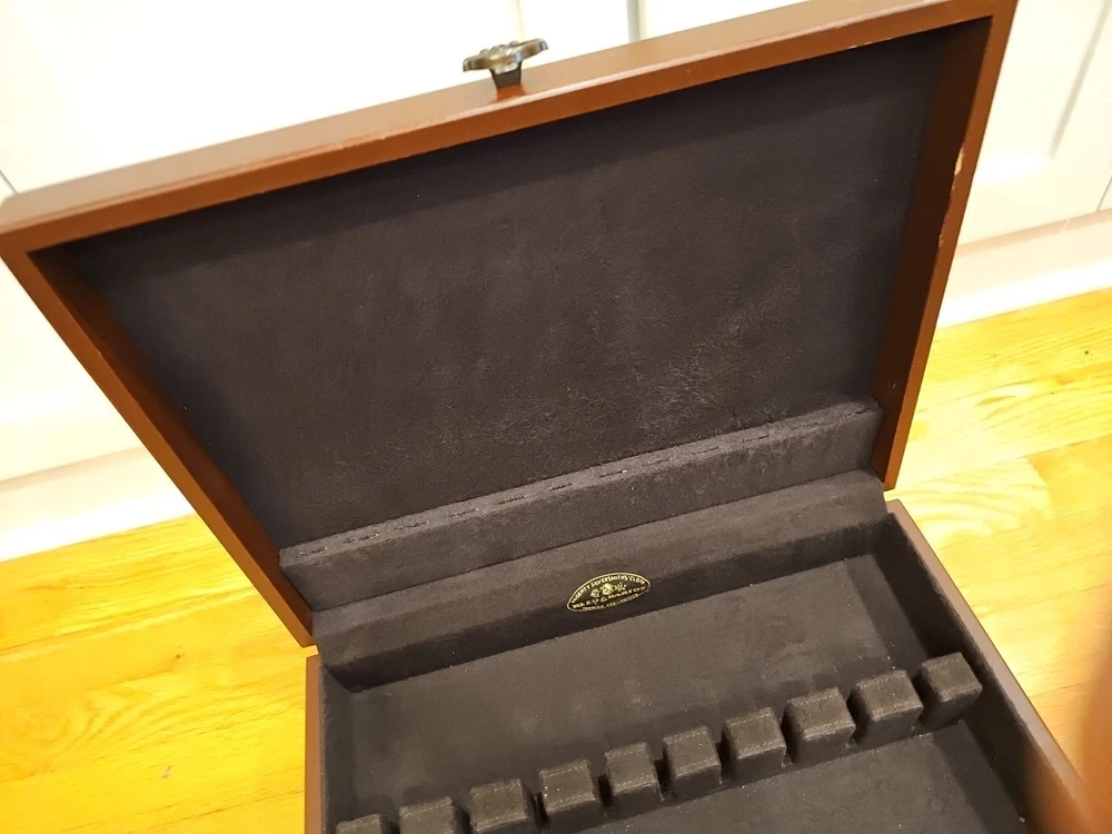 Reed & Barton Wooden Silverware case with a drawer. Very nice condition. Some scratches from use. A few tiny dents in the wood on the cover. Name plate on cover has never been etched and still has the protective plastic. Great side and drawer handles. Clean inside. Measures 14 3/4"" long x 6" high x 11 1/4" wide. A great redish brown wood.(maybe cherry, but not sure). Made by eureka mfg. Holds a service for 12. 12 knife slots on the cover.