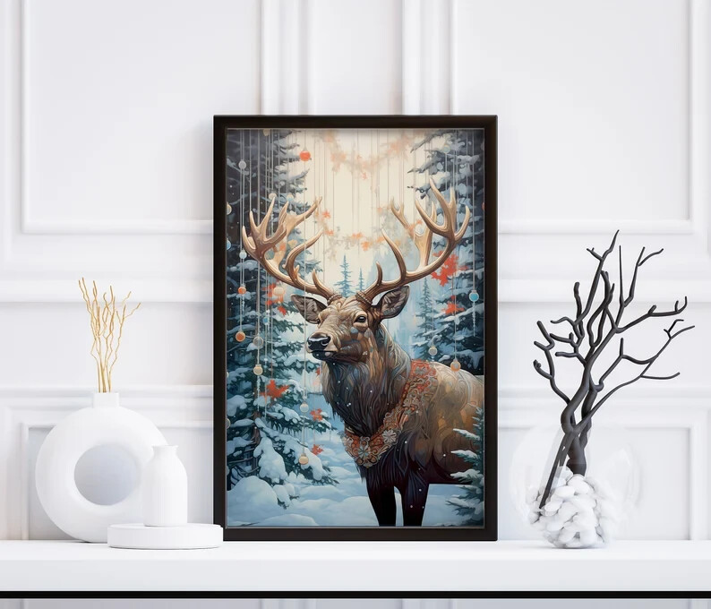 Vintage Reindeer Christmas Wall Art Holiday Decor Poster Unframed