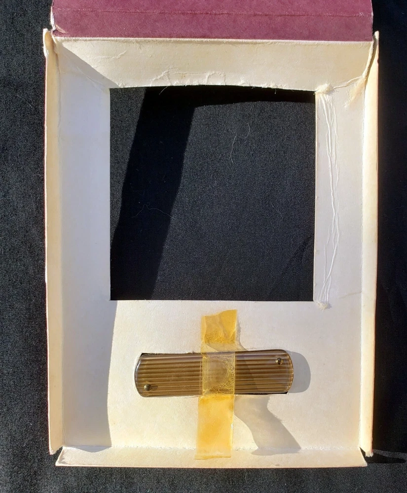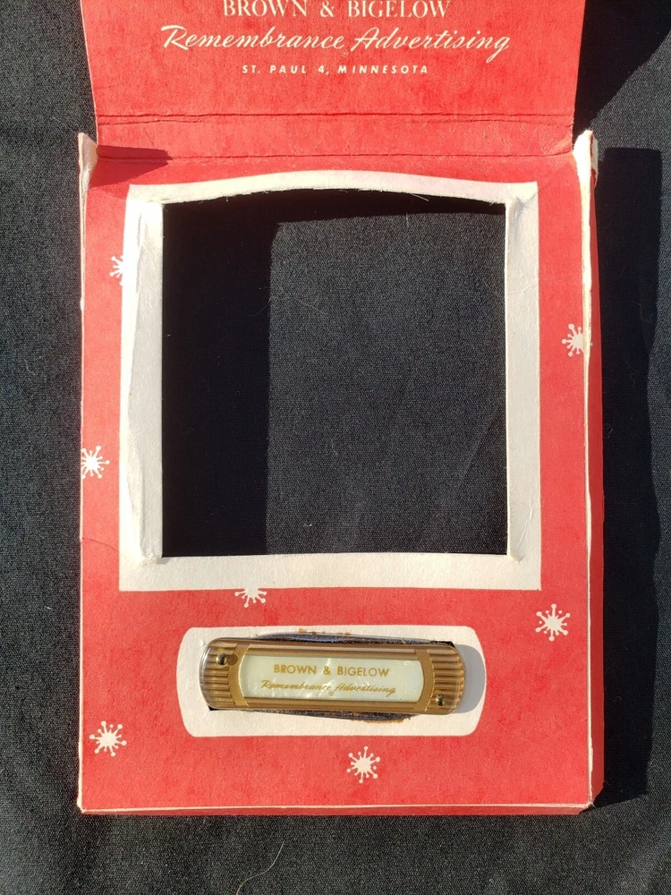 Vintage Paperweight and Pocket Knife in Original Box. Box has wear and a stain,insert has wear marks also, believe that these items were never used. The Paperweight is Brown on the bottom, Gold on the top with Clear over the Gold. It has the Liberty Bell on the front and the back has dates when the Liberty Bell rang. It is marked Remembrance B&B (Brown & Bieglow) St. Paul, MINN. U.S.A. It is approximately 3 1/4" x 3 1/8". The Paperweight is in Very Good Vintage Condition. Pocket Knife has not been removed from the box.