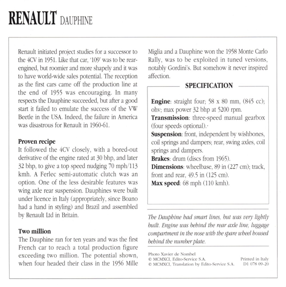 Iris Publishing Ltd Collectors Club Classic Cars card. Renault Dauphine 1956-1967 Popular category. Each card provides information and specifications of the featured car. Very good condition. Any scanning defects on the images, such as vertical lines, are not present on the actual card. Postage is combined for multiple purchases. Cards will be protected, and sent in stiff cardboard envelopes.
