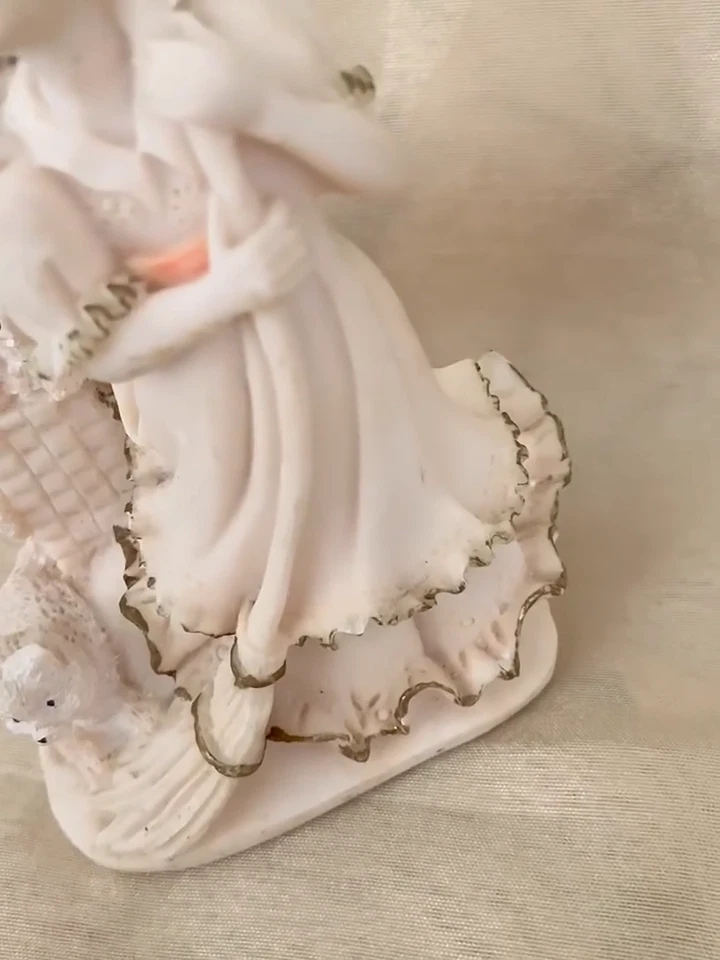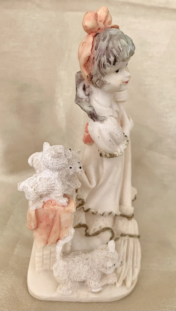 Sweet little girl is sweeping and has 3 pups looking after her. This is an ivory color, resin figurine. She has antique gold trim on her dress with pinkish accents. Her dress also has an eyelet appearance. Green felt on the bottom. Minor vintage wear. Measures approx 5”H and 3” W. Cute.