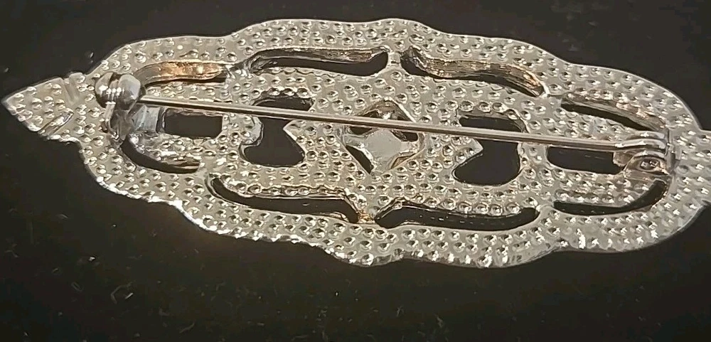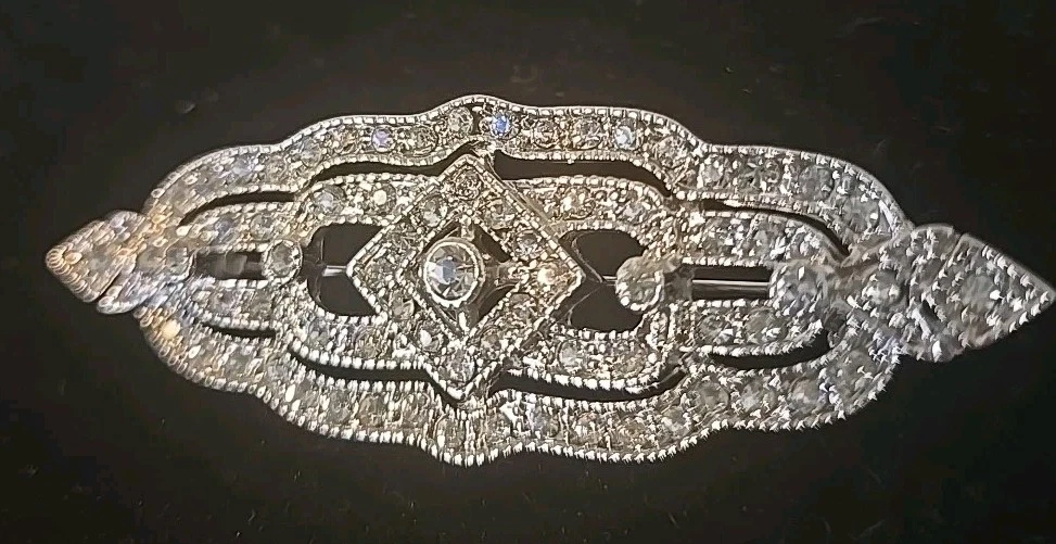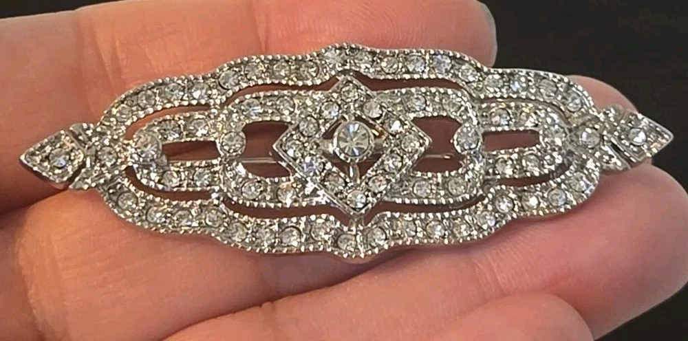 This Vintage Rhinestone Brooch Pin is a stunning piece of jewelry featuring a rectangular shape with a round white crystal as the main stone. The brooch has a Victorian and Art Deco design, measuring 2.5 inches in length. It is rhodium plated and showcases retro beauty, making it ideal for various occasions like engagements, anniversaries, birthdays, and more. This vintage piece is a lovely addition to any fashion collection.