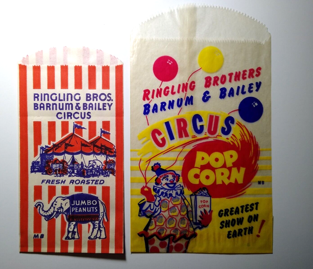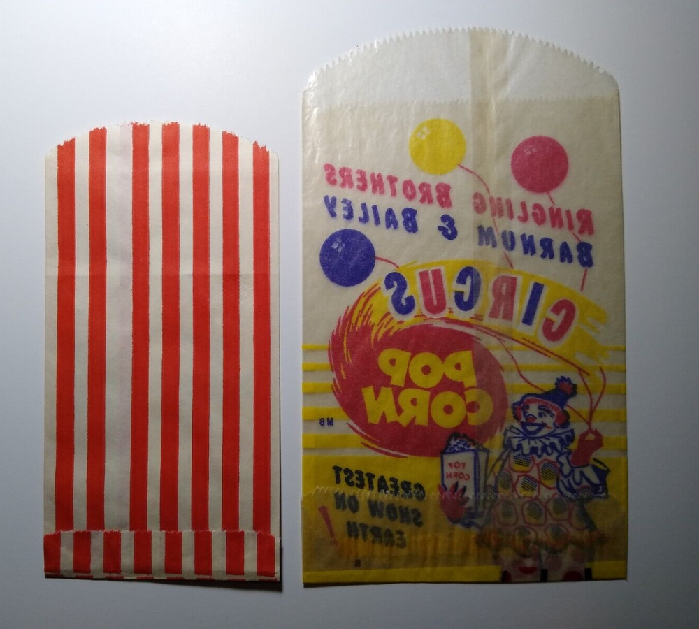 Unused old stock empty paper and wax glassine popcorn and peanut bags. Lot of (2) different. Measures between 6.75" - 8.25". Light creases and age wear.