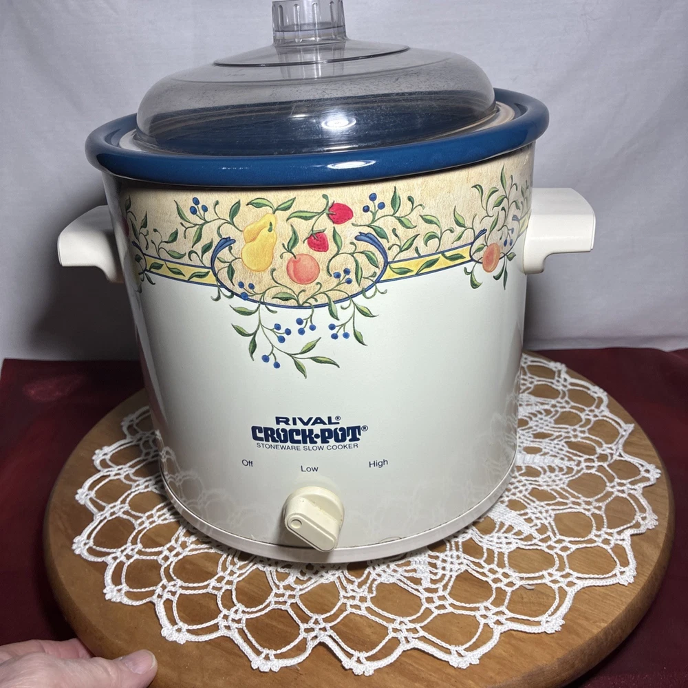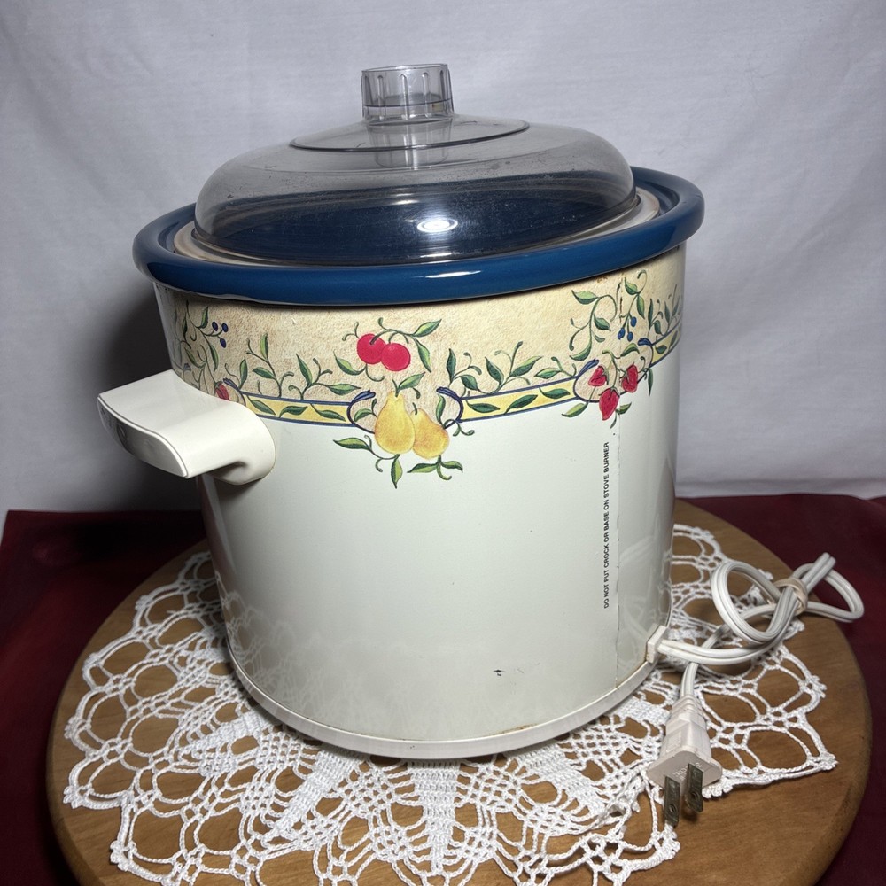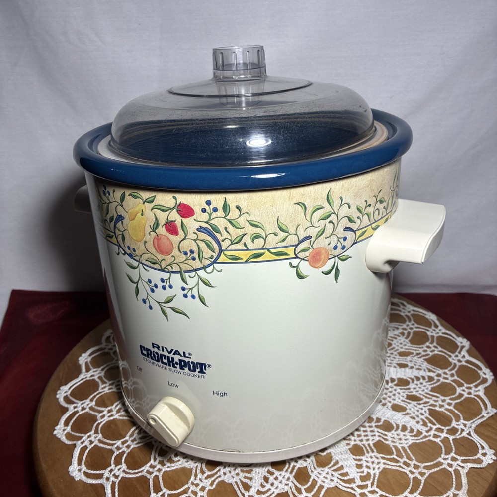 The Vintage Rival Crock Pot 3.5 Quart Model 3100 in blue with a fruit design is a charming and functional slow cooker. This electric appliance features a 3.5 quart stoneware pot with a stainless steel finish, stay-cool handles, and a portable design for ease of use. With a power range of 215-325 watts and three settings/programs, this Rival crock pot is a reliable and stylish addition to any kitchen, perfect for preparing delicious meals with ease.