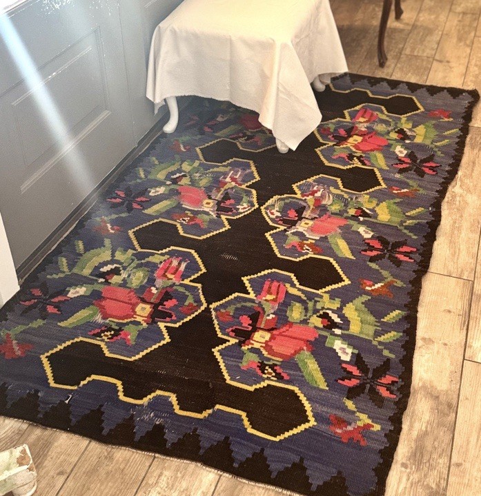 Striking vintage handwoven kilim rug featuring bold floral motifs set against a dramatic dark ground. This piece has a beautiful folk-art aesthetic with vibrant reds, greens, and blues arranged in a symmetrical pattern. Likely Eastern European (Romanian or similar region), this flatweave rug showcases traditional craftsmanship and timeless design. The geometric floral layout gives it a modern edge while still feeling rooted in old-world style. Perfect for a kitchen, hallway, entry, or layered in a living space. Works beautifully in traditional, eclectic, farmhouse, or European-inspired interiors. ⸻ Details: • Type: Handwoven kilim / flatweave • Material: Wool • Origin: Likely Eastern European (Romanian) • Colors: Black, navy, red, green, yellow • Condition: Good vintage condition with wear consistent with age (see photos)