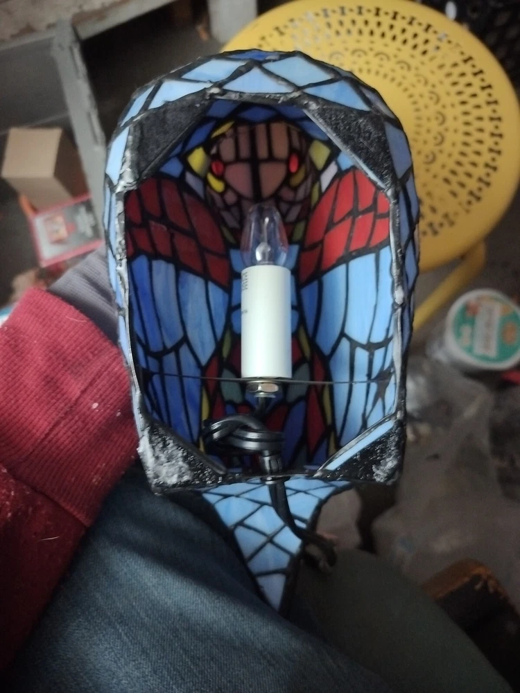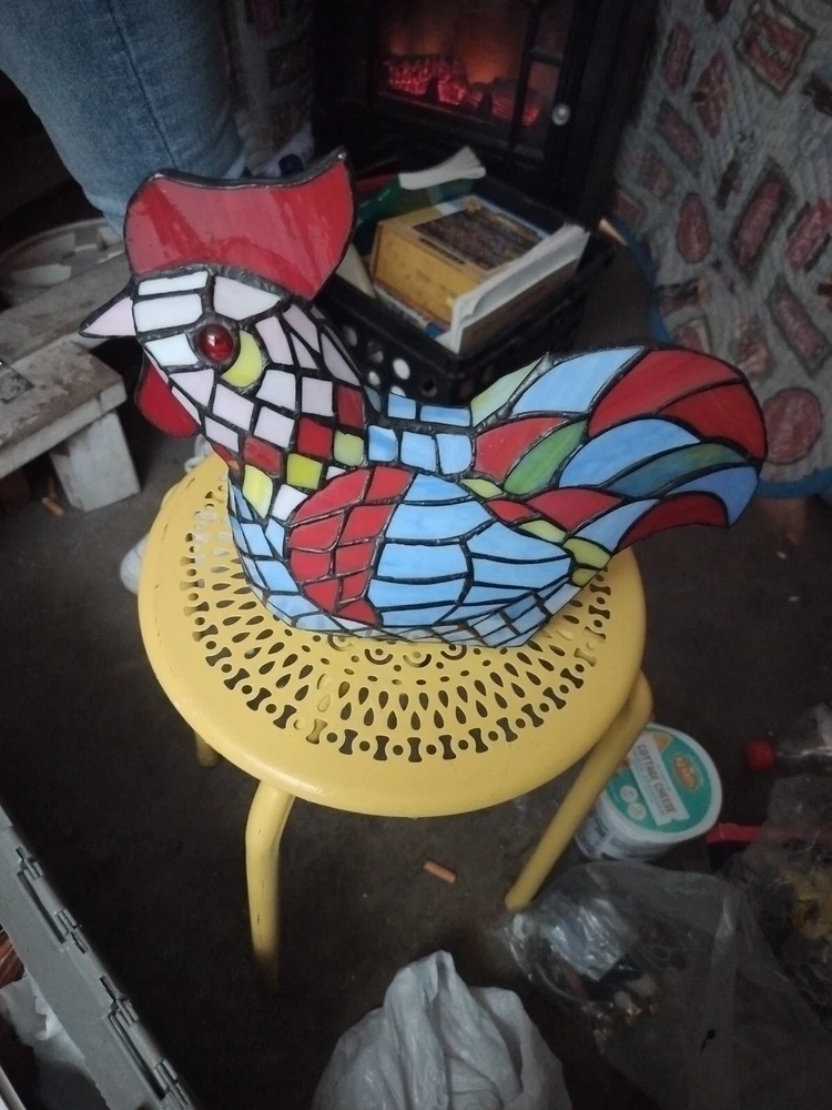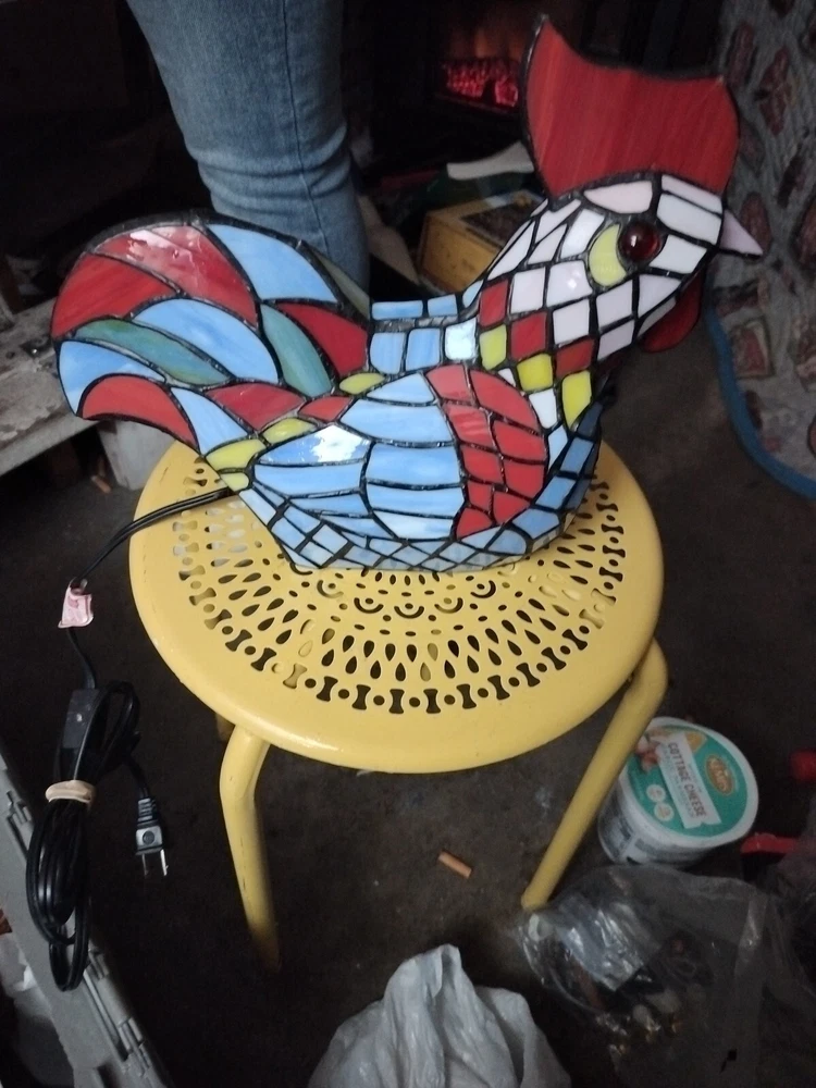This vintage Rooster Chicken Lamp features a charming design with stained glass and mosaic detailing in a vibrant blue color. The lamp is powered by corded electric and includes a black cord for easy use. It exudes a country style and is sure to add a cozy touch to any space, featuring a light sensor for convenient operation as a night light. This unique piece is perfect for collectors or those who appreciate retro decor with a touch of whimsy.