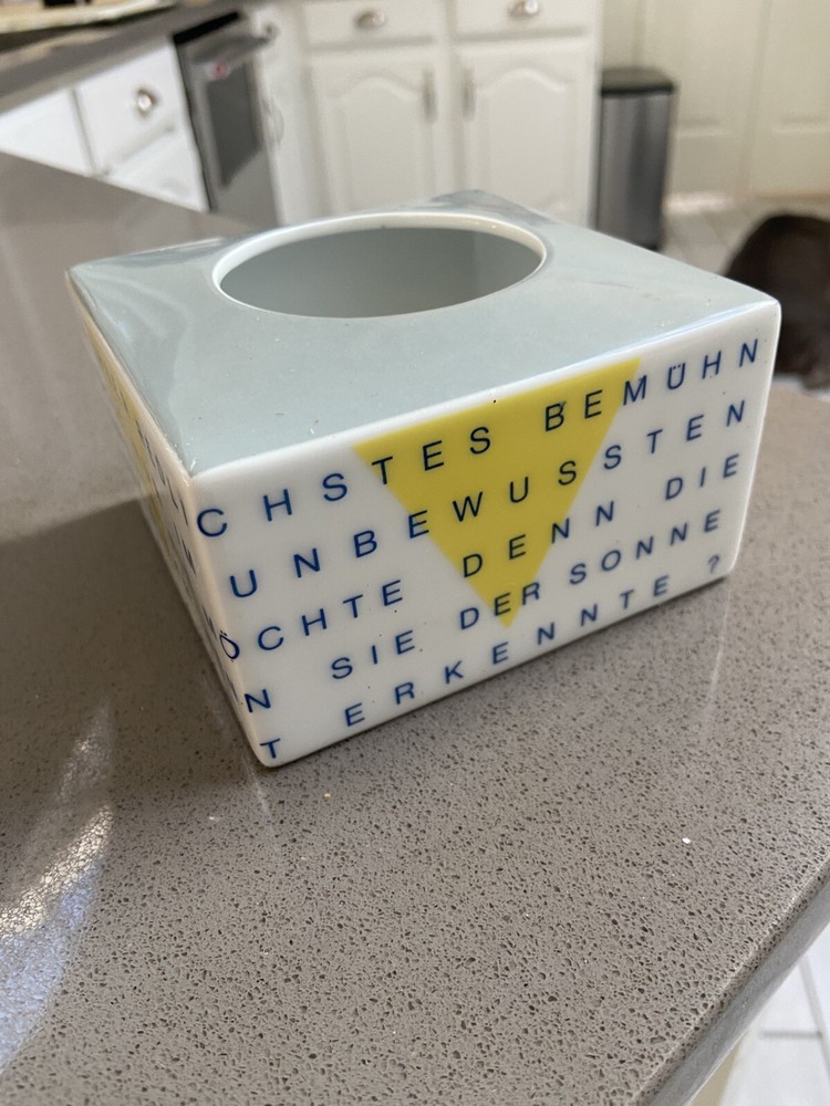 Really cool candle holder see photos for the best description. It has some writing on the side. I’m not too sure what it says. It’s in German, but it seems to be inspirational saying according to my Google translate lol it measures 4” x 4” in diameter and it is about 3 inches tall