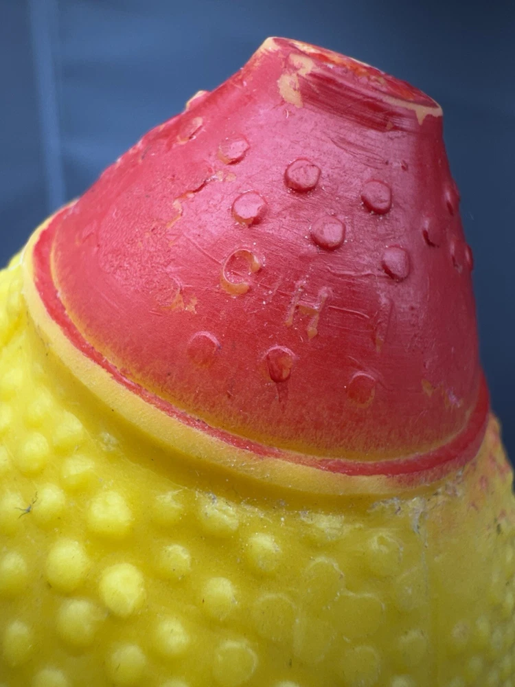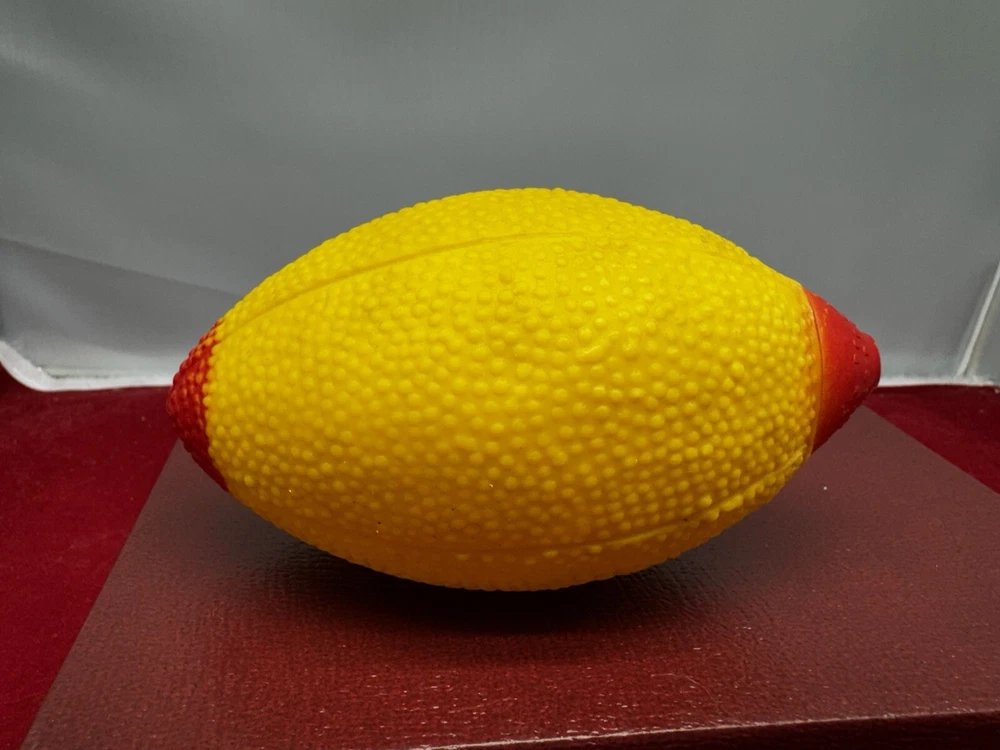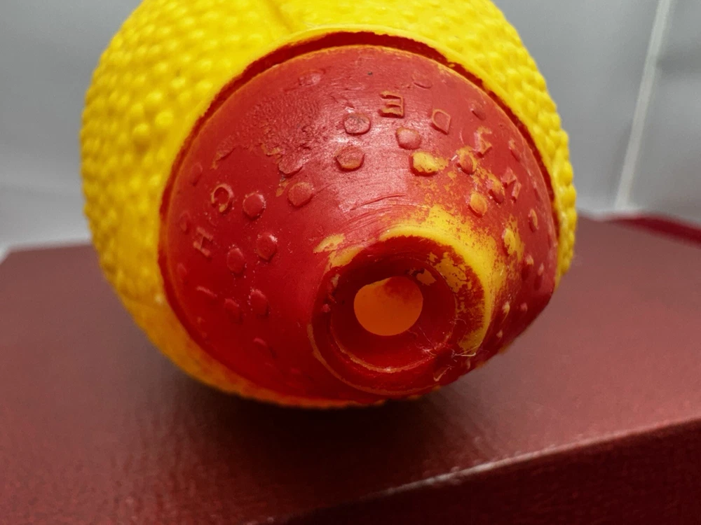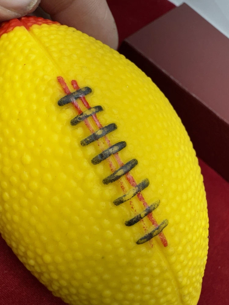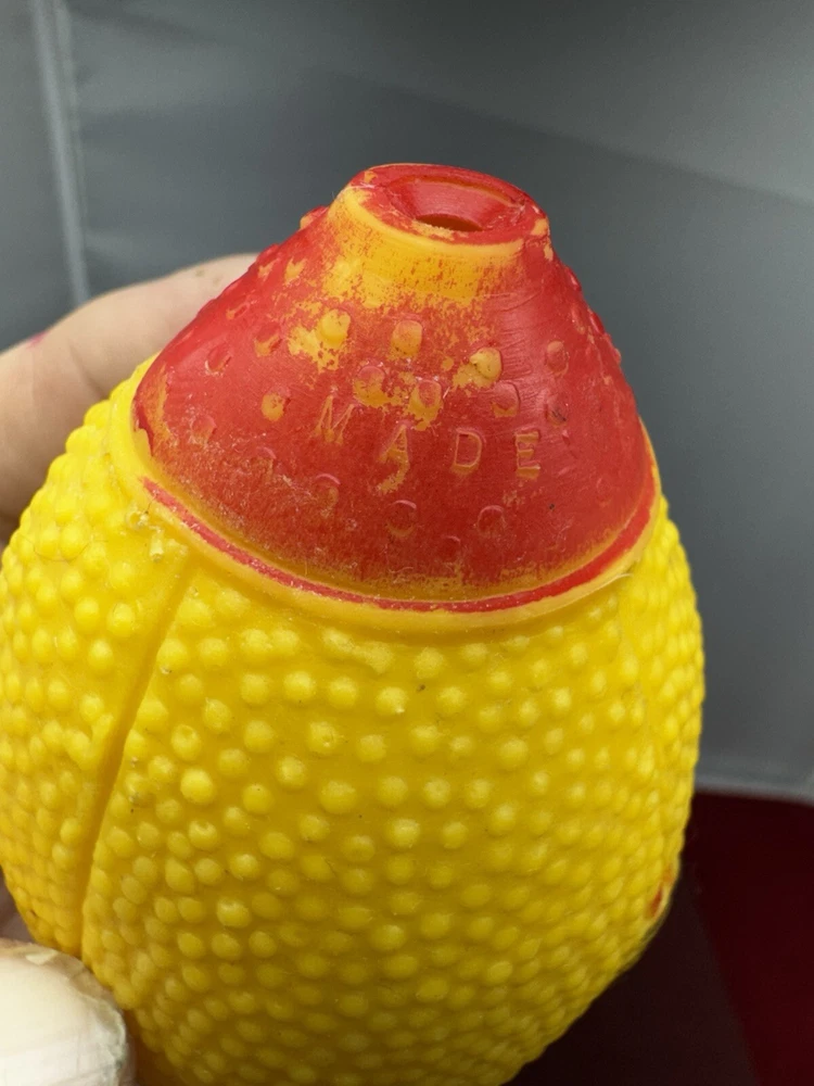 This vintage rubber squeaky toy is in the shape of a mini football and is designed to make a squeaking sound when squeezed. It is a collectible item that appeals to those interested in vintage and antique toys. The toy is marked as "works," indicating that the squeaking mechanism is functional, adding to its charm for collectors of nostalgic items. Perfect for adding a touch of vintage charm to any toy collection.