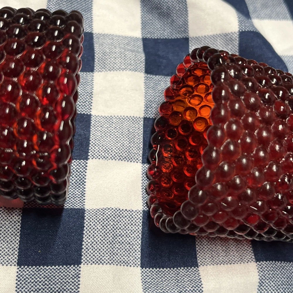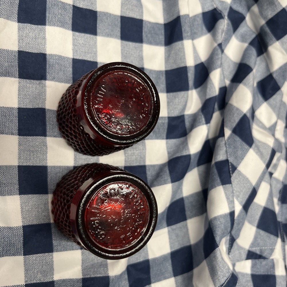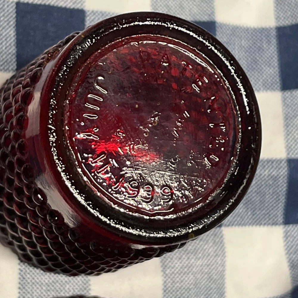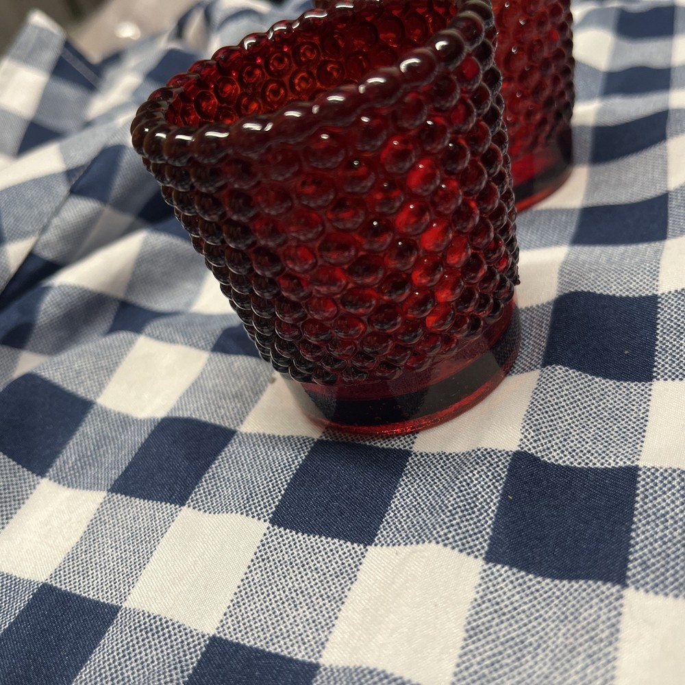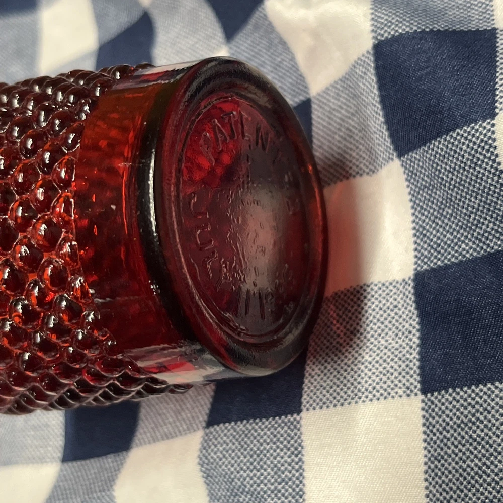 This vintage ruby red hobnail glass votive candle holder is a small, round Art Deco style piece patented on July 11, 1939. It features a glossy finish and textured design, making it suitable for all occasions and any room in the home. Made of glass and measuring 2 1/2 inches in height, this original collectible comes in a set of 2 and weighs 2 lbs. Perfect for adding a touch of elegance to any space, this unique candle holder is a timeless piece from the early 19th century. You’re buying the set. One price