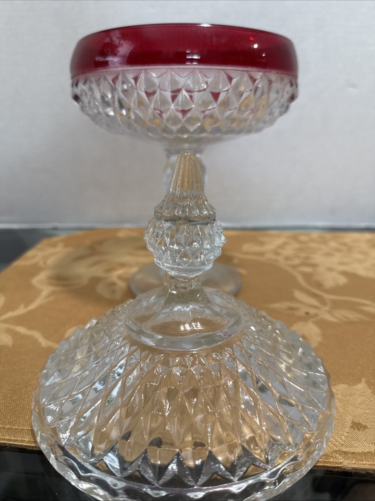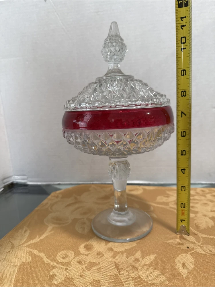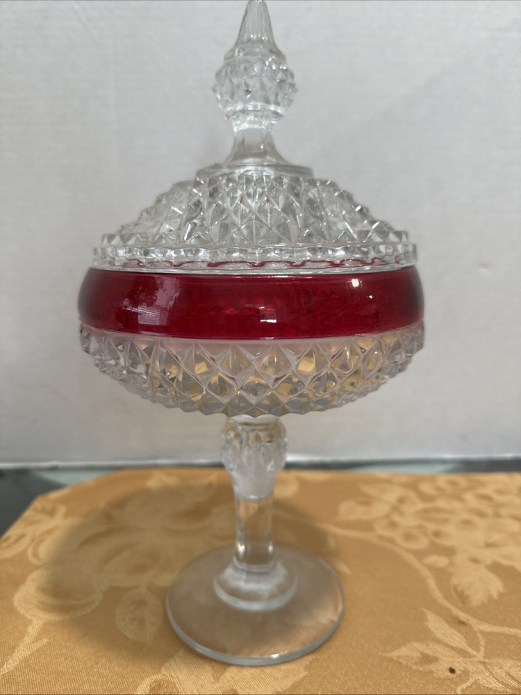 The Vintage Indiana Glass Ruby Red Flashed Diamond Point Compote with Lid is a beautiful piece of decorative collectible made of glass. This round bowl set features a clear and red color with a diamond pattern, showcasing the craftsmanship of the Indiana Glass Co. The set includes a compote or candy dish with a lid, measuring 12 inches in height and 3 inches in depth, with a bowl diameter of 6.5 inches. This original piece from the United States adds a touch of elegance to any collection or display. Look at the pictures before making your purchase