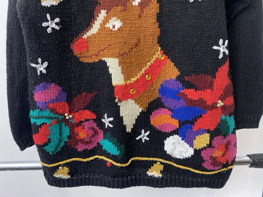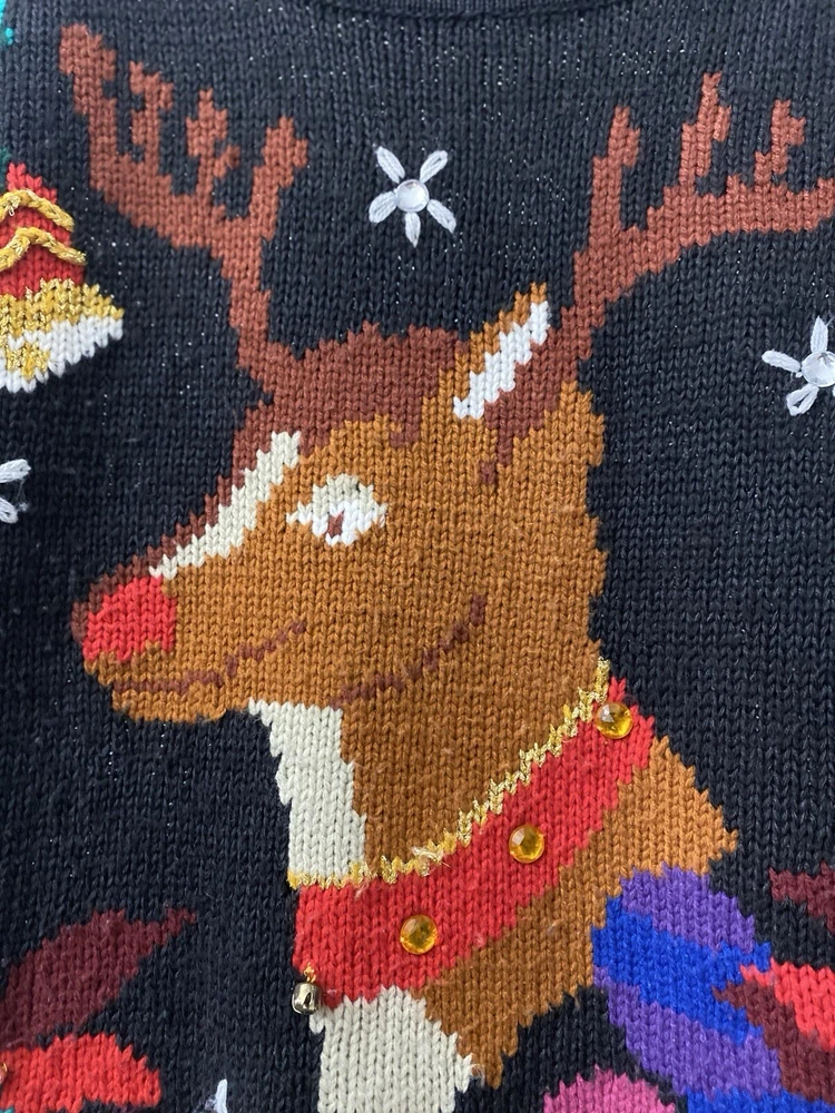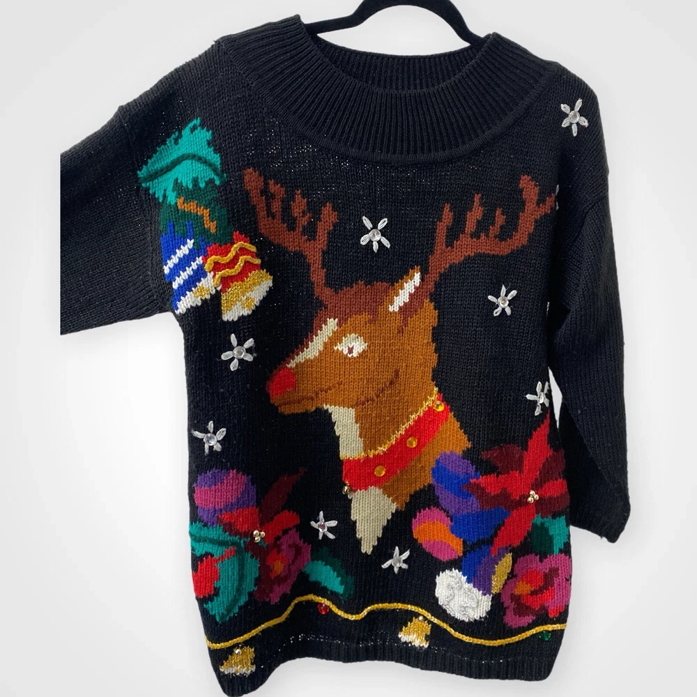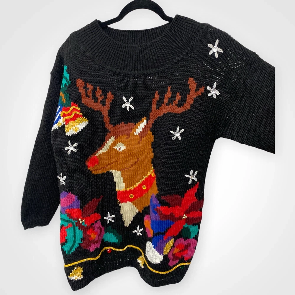 Sleeve Length: Long Sleeve Color: Black Occasion: Casual, Party/Cocktail Type: Sweater Character Family: Rudolph, the red nose, reindeer Material: Acrylic, Cotton, Ramie Neckline: Round Neck Style: Pullover Vintage: Yes Size Type: Regular Size: M Fabric Type: Knit Personalize: No Season: Winter Country/Region of Manufacture: Hong Kong Brand: Holiday Accents: Rhinestone, bell, knit design Garment Care: Machine Washable Features: Heavyweight, festive, Lightweight Pattern: Solid Fit: Regular Knit Style: Tight-Knit Sleeve Type: long sleeve Character: Rudolph Theme: Christmas, Holiday, 90s, 80s Department: Women