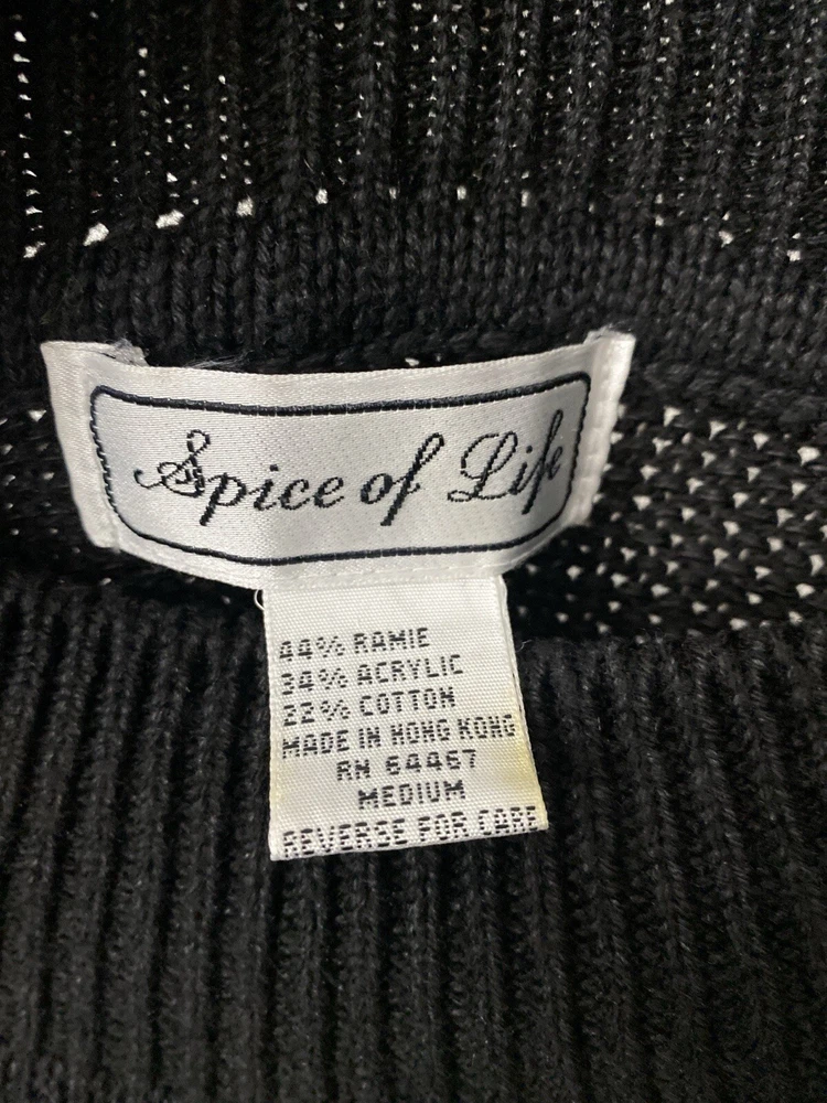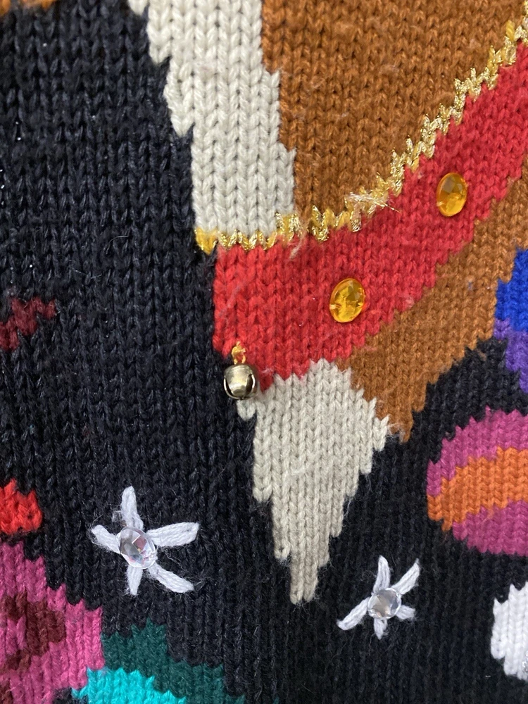 Vintage Rudolph Christmas Sweater - Black Holiday Knit Sweater- Medium This Vintage Rudolph Christmas Sweater by Spice of Life (possibly 80s or 90s) is a holiday must-have! This festive sweater features Rudolph the Red-Nosed Reindeer with a real bell around his neck. The design is adorned with poinsettias, bells, snowflakes, and gem accents for extra sparkle. Key Features: Brand: Spice of Life Material: 44% Ramie, 34% Acrylic, 22% Cotton Size: Medium (Fits true to size; can also work as a dress for petite frames) Color: Black with multicolor festive design Design Details: Real bell, intricate knit pattern, gem accents, poinsettias, snowflakes Condition: Pre-owned, good vintage condition Measurements: Bust: Approx. 19" Length: Approx. 25" Sleeve Length: Approx. 23" Perfect For: Holiday parties, festive gatherings, or even as a statement holiday dress paired with boots! — Vintage Rudolph Sweater, 80s Holiday Knitwear, Christmas Sweater Medium, Festive Reindeer Sweater, Poinsettia Snowflake Gem Sweater, Ugly Christmas Sweater Chic