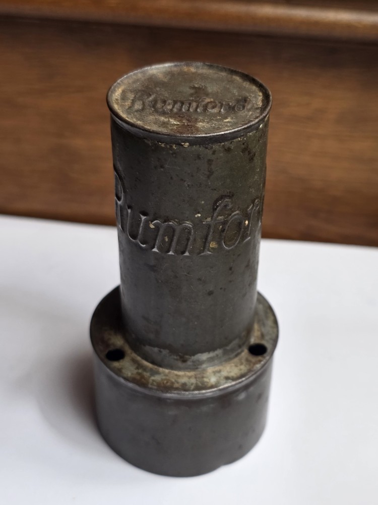 The Vintage RUMFORD BAKING POWDER Tin Metal biscuit cutter is a charming piece of advertising memorabilia from a bygone era. Made of durable tin, this primitive biscuit cutter features a unique design that would make a great addition to any antique or primitive collection. Signed with the brand's name, this item serves as a nostalgic reminder of the history and popularity of RUMFORD BAKING POWDER. Great condition.