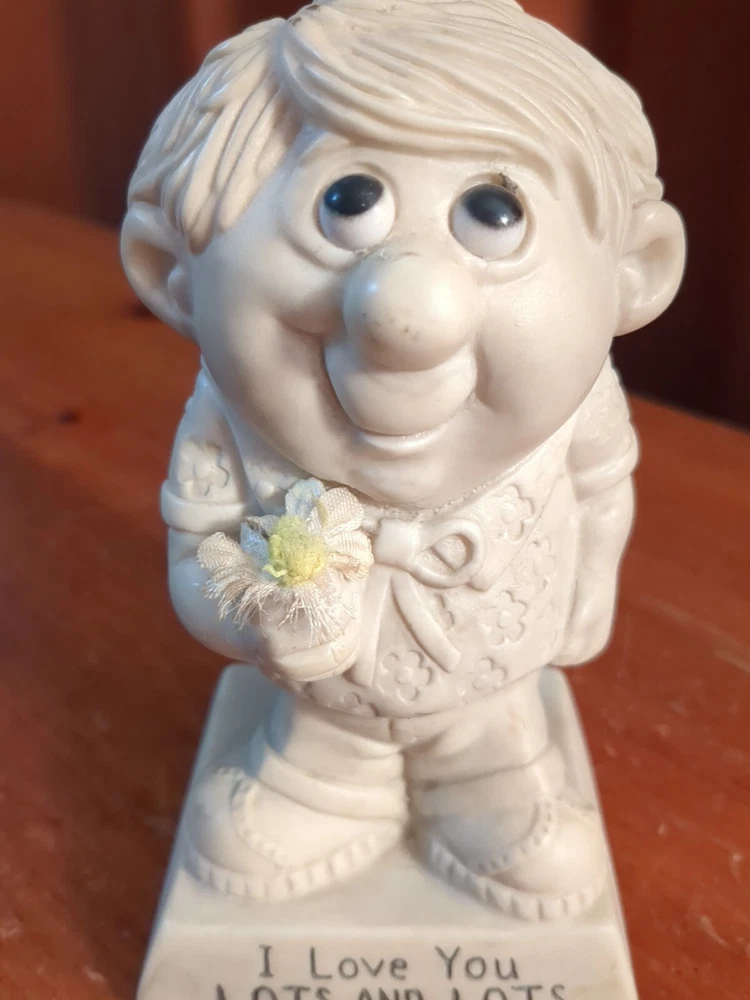 This vintage Russ Berrie figurine is a charming addition to any collection. Crafted from resin, it measures 6 inches in length and is from the 1970s. The figurine is an original piece and features a medium size with a subject of love. Perfect for collectors of decorative items, this figurine is a must-have for those who appreciate vintage pieces.