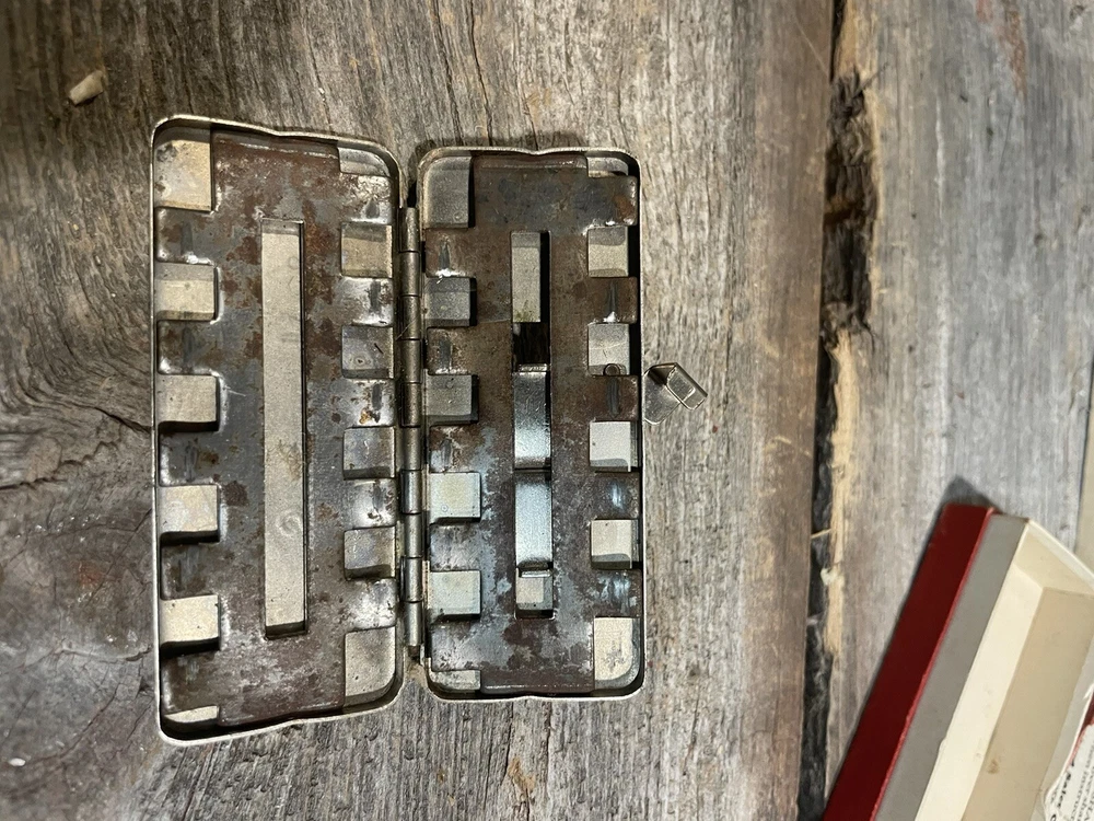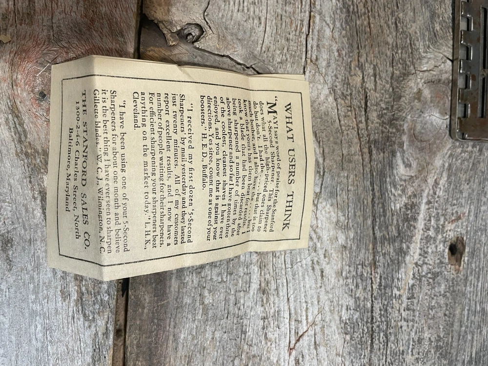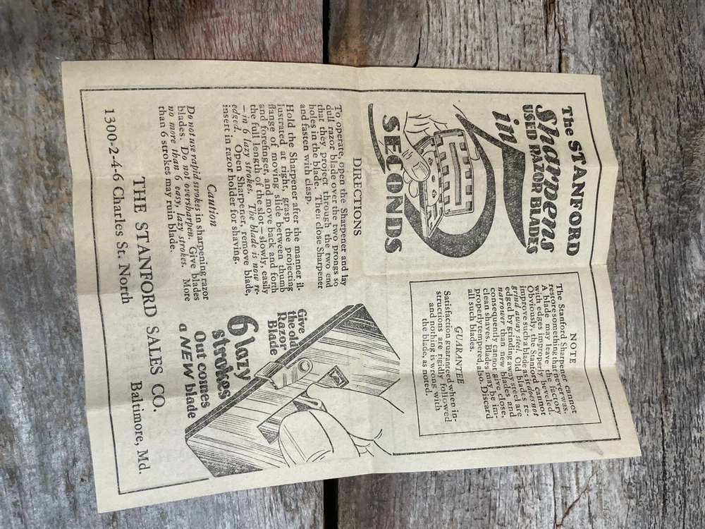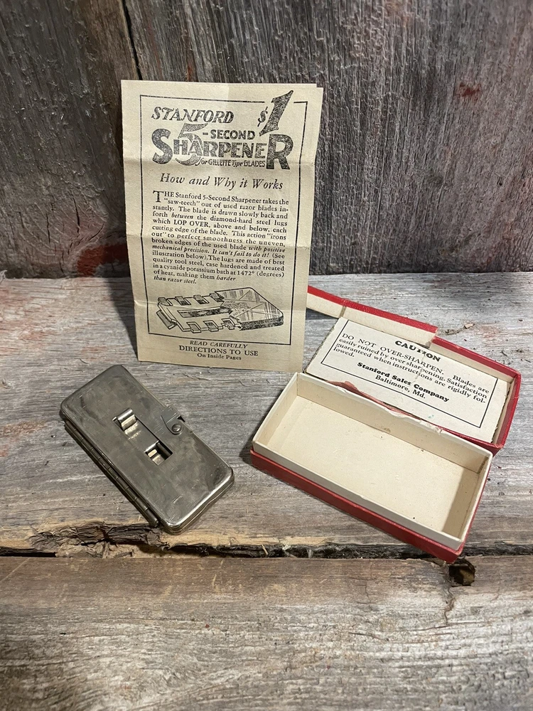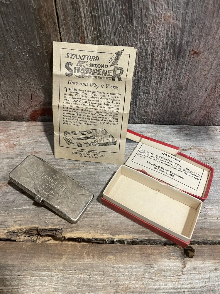 This vintage double edge blade sharpener by STANFORD MFG. CORP is a must-have for any collector of shaving memorabilia. Made in the United States, this sharpener measures 2 7/8 in x 1-1/4 in and is perfect for sharpening your blades to perfection. Whether you're a seasoned shaver or just starting out, this sharpener is easy to use and will keep your blades sharp for a long time. The STANFORD MFG. CORP 5 SECOND SHARPENER is a classic piece that will add value to any collection. Box has some damage