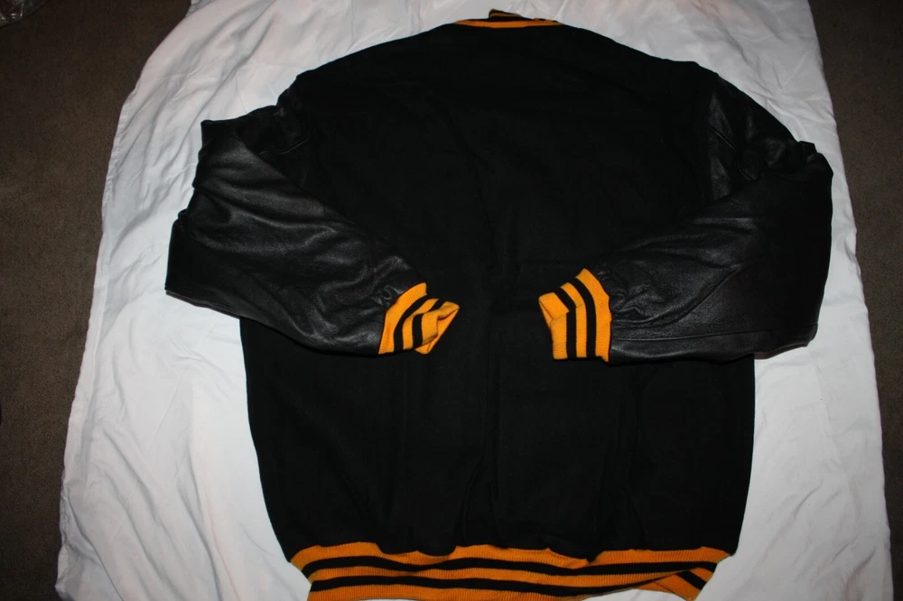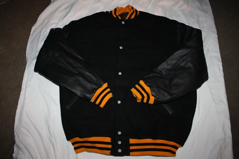 Size: 3XL Color: Black Collar Style: Band Personalize: No Pattern: Striped Garment Care: Dry Clean Only Brand: Stewart & Strauss Fit: Regular Theme: Letterman Country/Region of Manufacture: United States Insulation Material: Wool Vintage: Yes Features: Collared, Lined, Pockets, Wind-Resistant Accents: Button Fabric Type: Fleece Outer Shell Material: Leather Closure: Button Size Type: Regular Style: Varsity Jacket Type: Jacket Season: Fall, Spring, Winter Department: Men