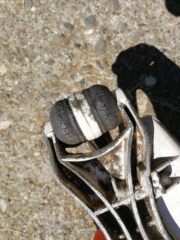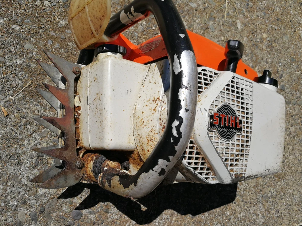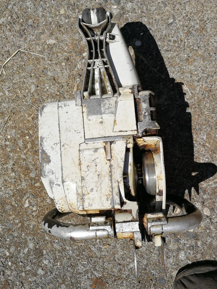Collectors vintage Stihl 051av chainsaw with wrap handlebar and dual falling spikes. Nice looking saw overall. Nice collectors piece. Strong compression. Fires up in few pulls. Idles great. It is very smoky. Oils good. There is a patch on the side of the case. Nice looking piece for a collection. Did not cut with is. May or may not need carb work or other repairs. No bar or chain, but I have those that I can list. This did have a roller nose tip that I will list. 33 inch. Thanks for looking, Dave