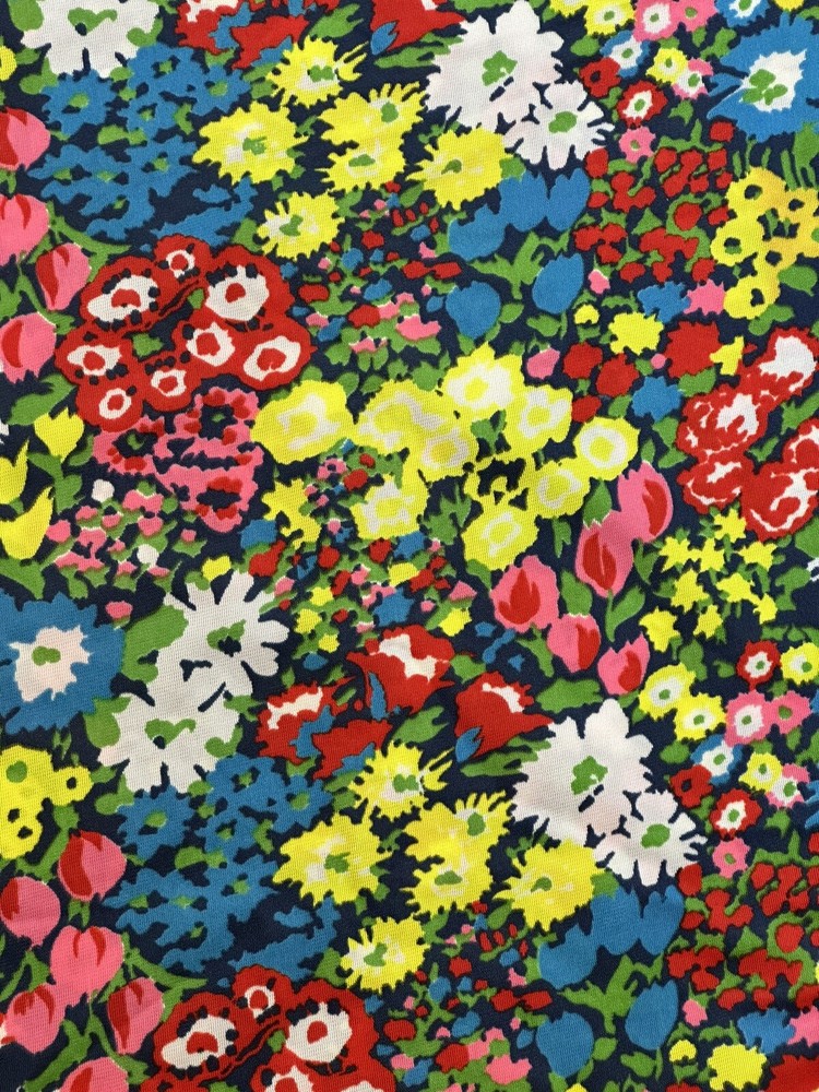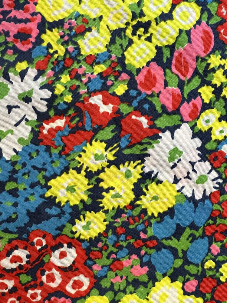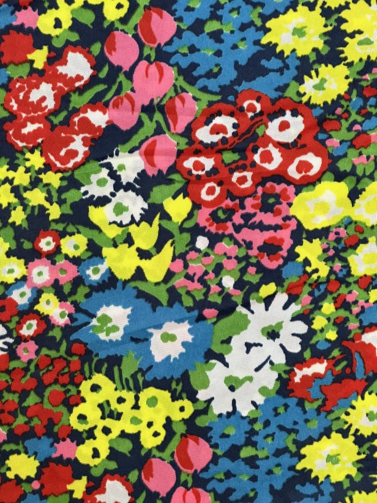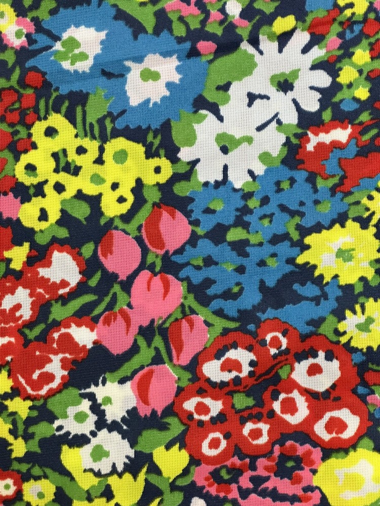 This vintage fabric features a bold floral pattern and is made of a stretchy polyester material with a medium weight. The fabric is 4+ yards in length and 62 inches in width, making it suitable for apparel projects such as dresses, loungewear, and everyday clothing. The beautiful colors and flower theme make it a great choice for any crafting project. The fabric's fiber content is polyester, and it is not sure if there is a blend of fabrics because there is no information about the content of the fabric. This was a beautiful estate sale find! the fabric's features include its beautiful colors and pattern, making it a unique and valuable addition to any crafting collection.