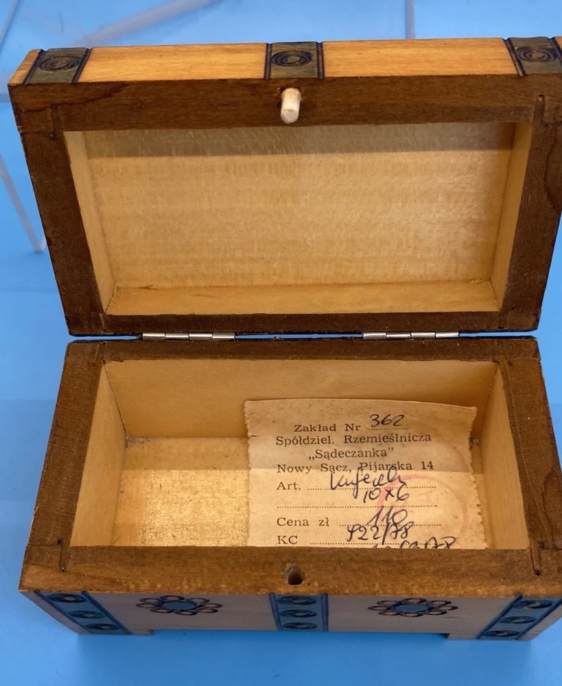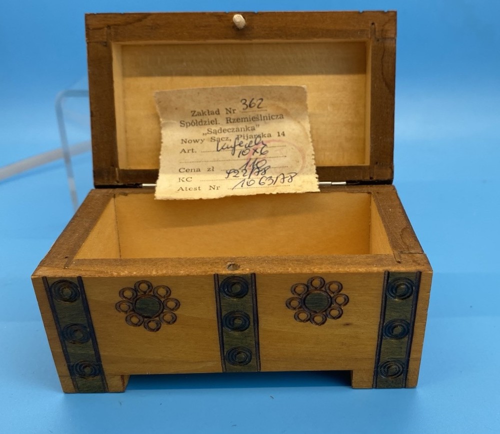 Polish wooden box, mid-20th century. The label describes it as made by Zakład Nr 362, a cooperative called "Sądeczanka" in Nowy Sącz, Poland, located on Pijarska street 14. The item is described as "Kufedly" (small chest or box), with a price, control number (KC), and attestation number 1063/78. Box is handmade from Linden wood in the Tatra Mountain region of Poland, using traditional techniques. Not used, from collection.