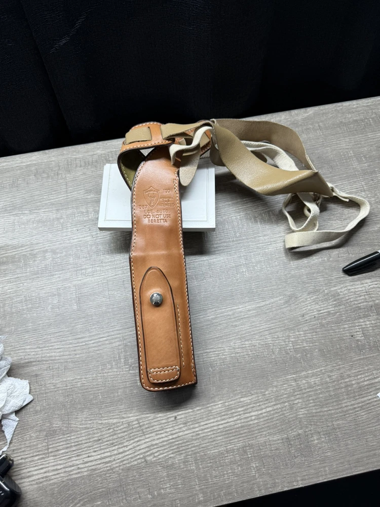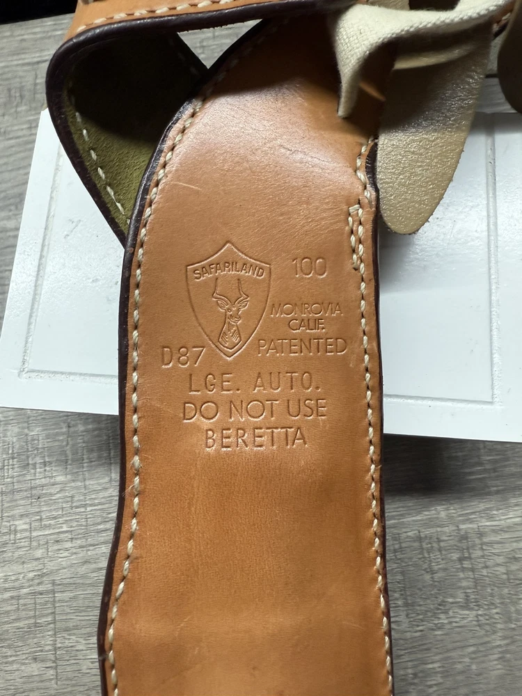 The product is a vintage Safariland # 100 Leather Shoulder Holster designed for a large auto firearm. It is specifically made for Smith & Wesson revolvers and features a brown leather construction. The holster is intended for shoulder carry and is designed for concealment.