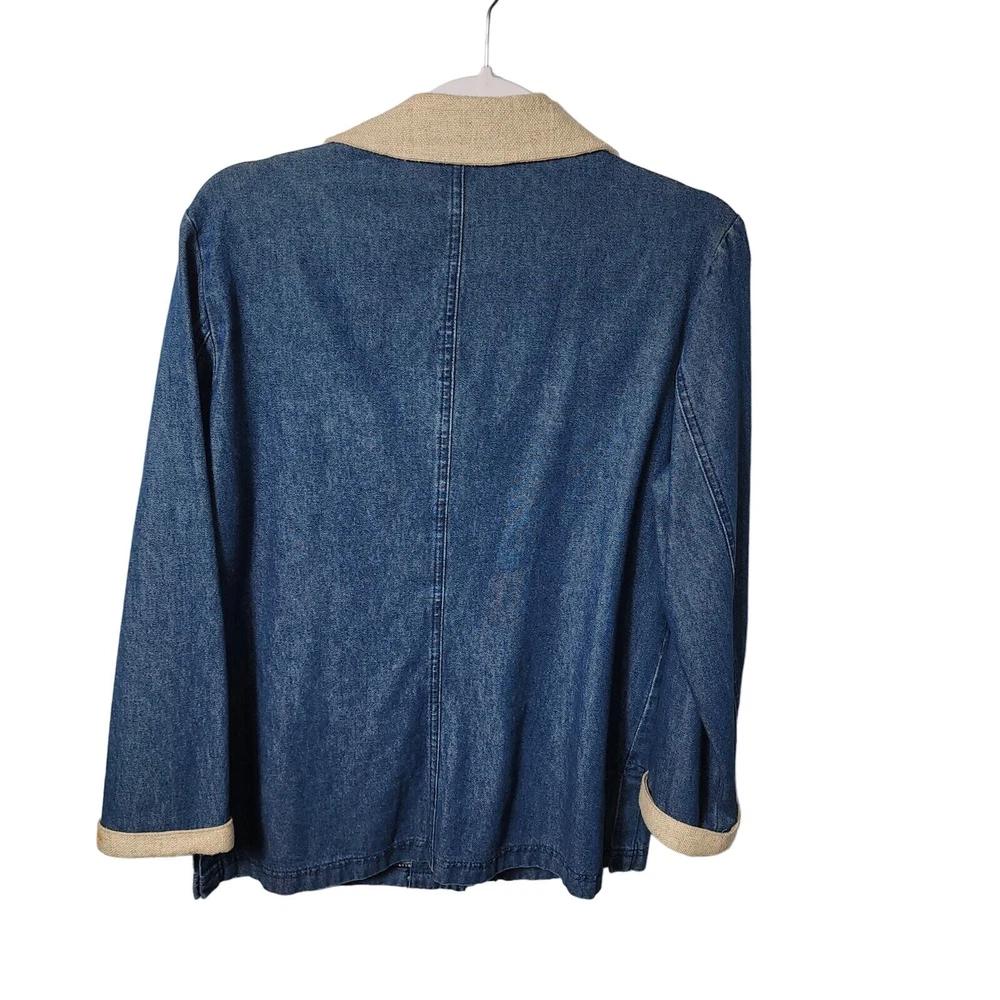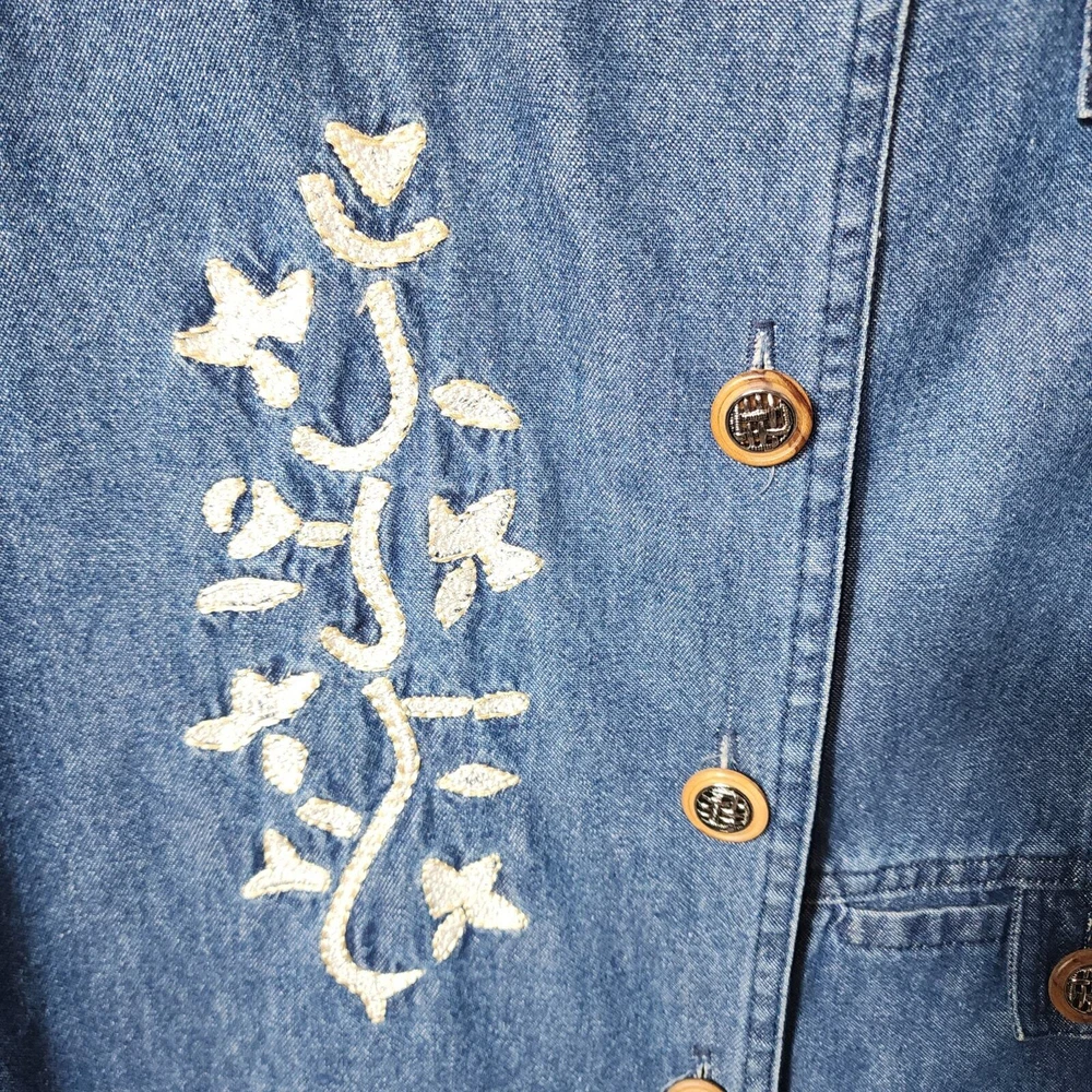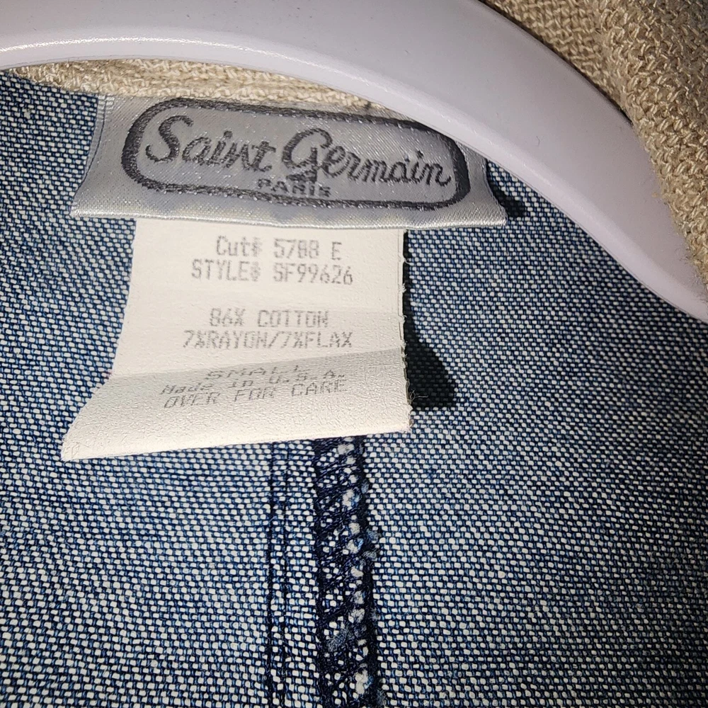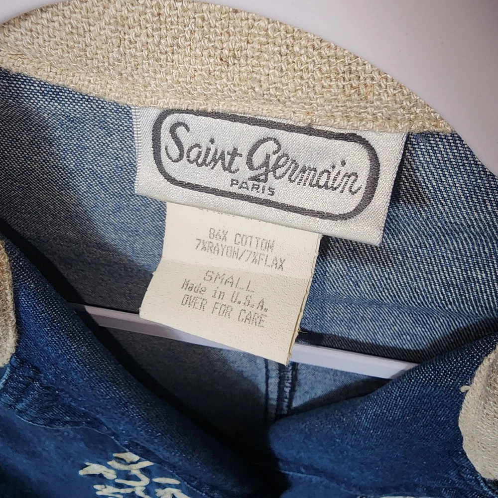 Vintage Saint Germain Paris Cotton Flax blean Embroidered details Jean Jacket Sz S Cottagecore, made in the USA, Button front. Longline. Excellent Pre-owned condition. Tags: Vintage, Retro, Cottage
