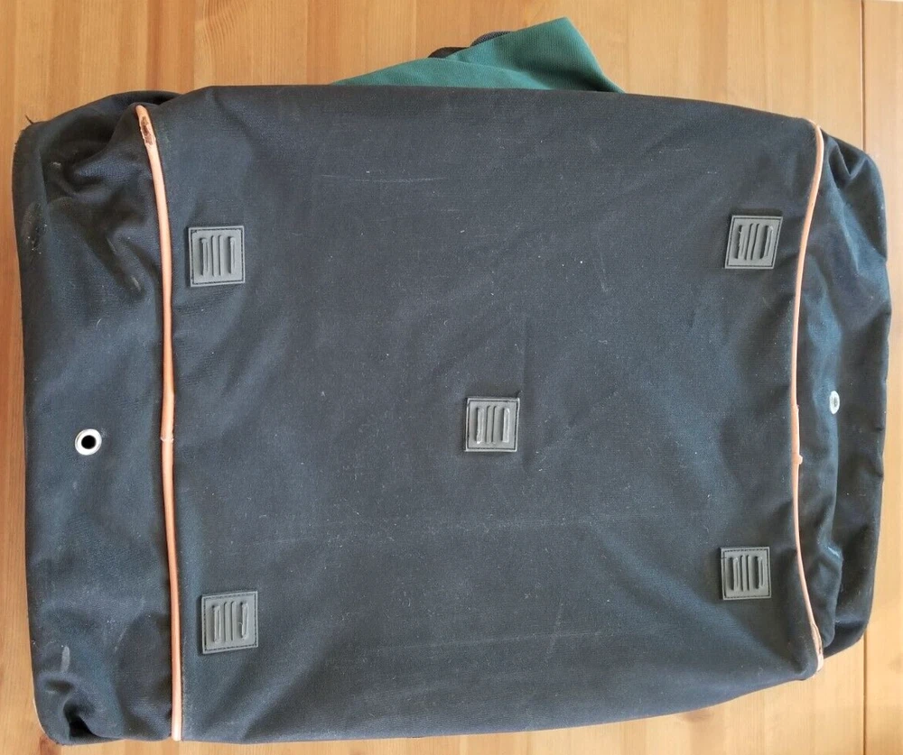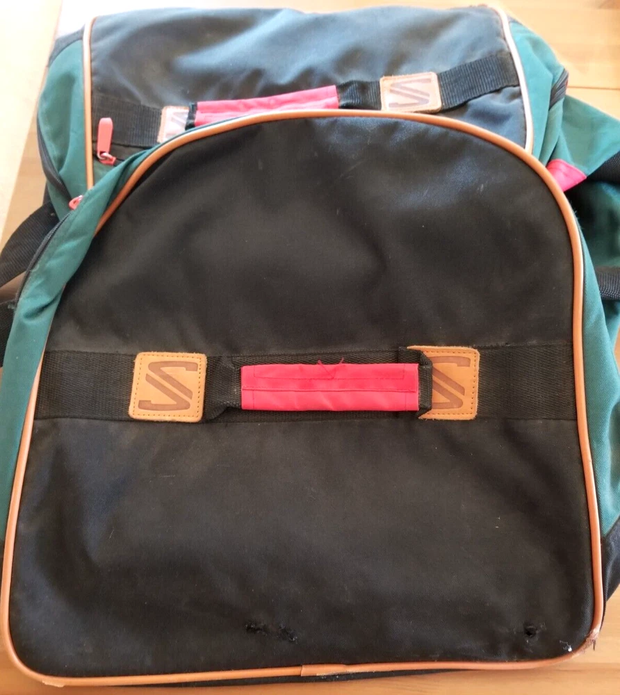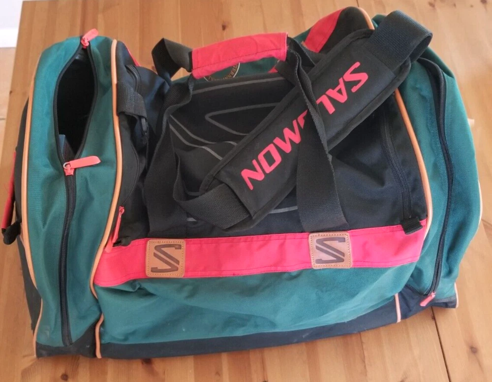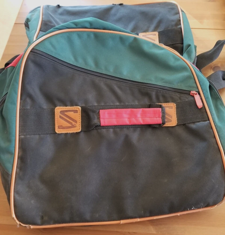 Vintage Salomon Large 24" Duffle Ski Boot Bag MINIMUM BID: $9.95 CONDITION: Pre-owned and very good overall. See photos for the six small tears on the brown welting at the bottom corners and two small tears in nylon close to bottom on the side without zip pocket. SHIPPING: Buyer pays to U.S. States and U.S. Territories. No returns.