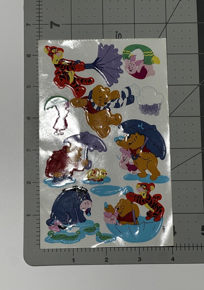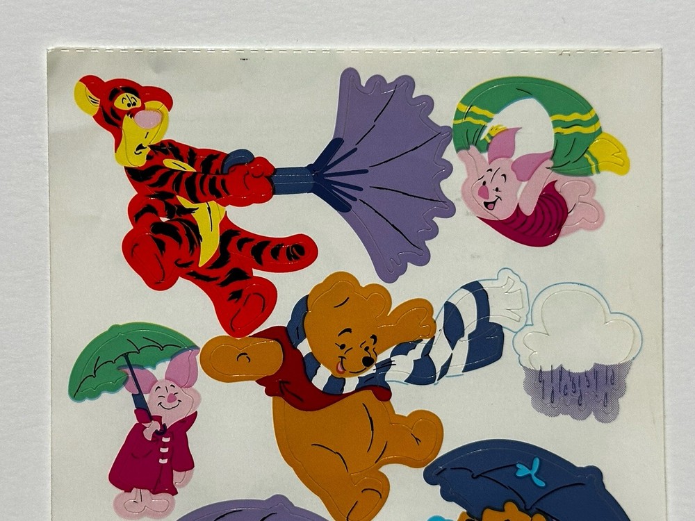 This sticker sheet from the vintage Disney and Sandylion collaboration features Winnie the Pooh and friends having fun in the rain. These adorable and vibrant stickers will make a great addition to any vintage sticker collection, Winnie the Pooh fan, and/or crafter! The sticker sheet is in great, vintage condition with normal signs of wear from handle and time. Please review all of the pictures and ask any questions as this is sold as is. Thank you for your time! :)