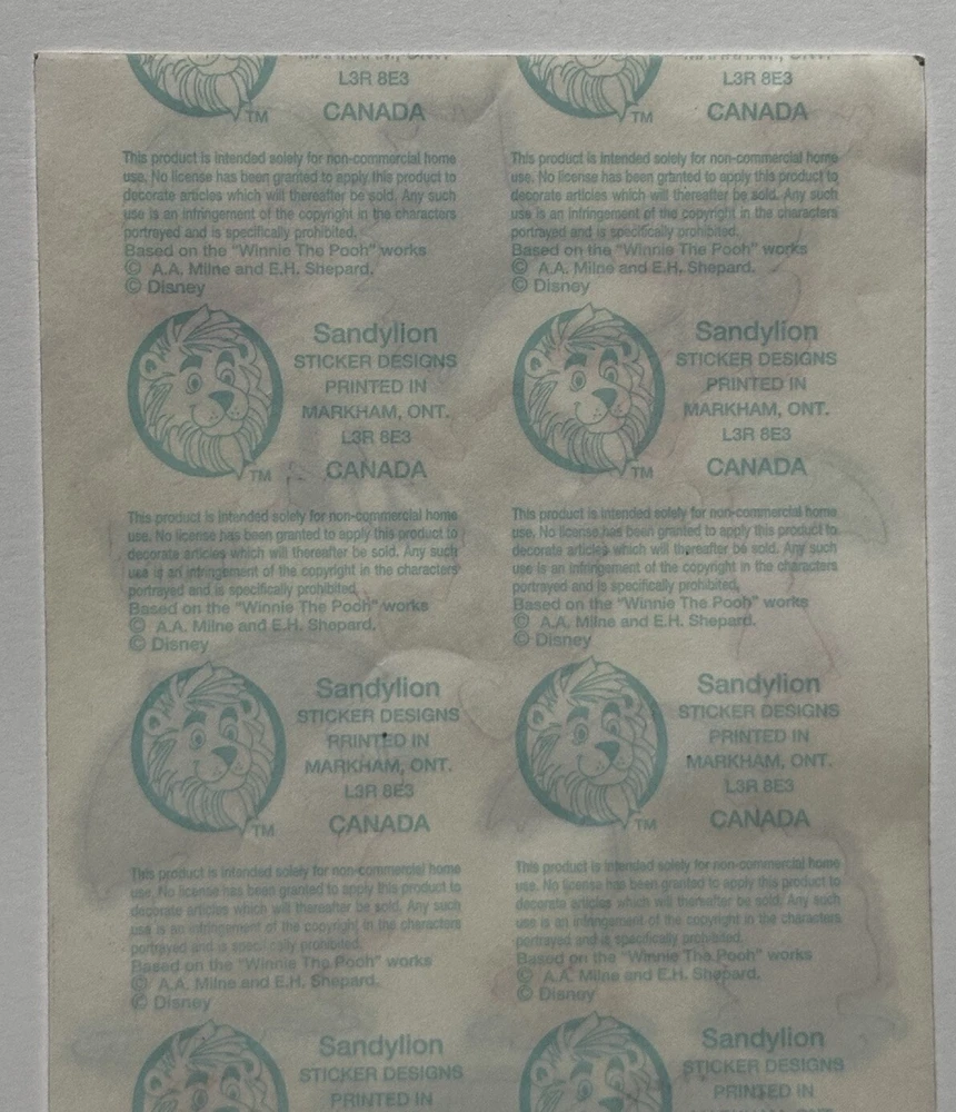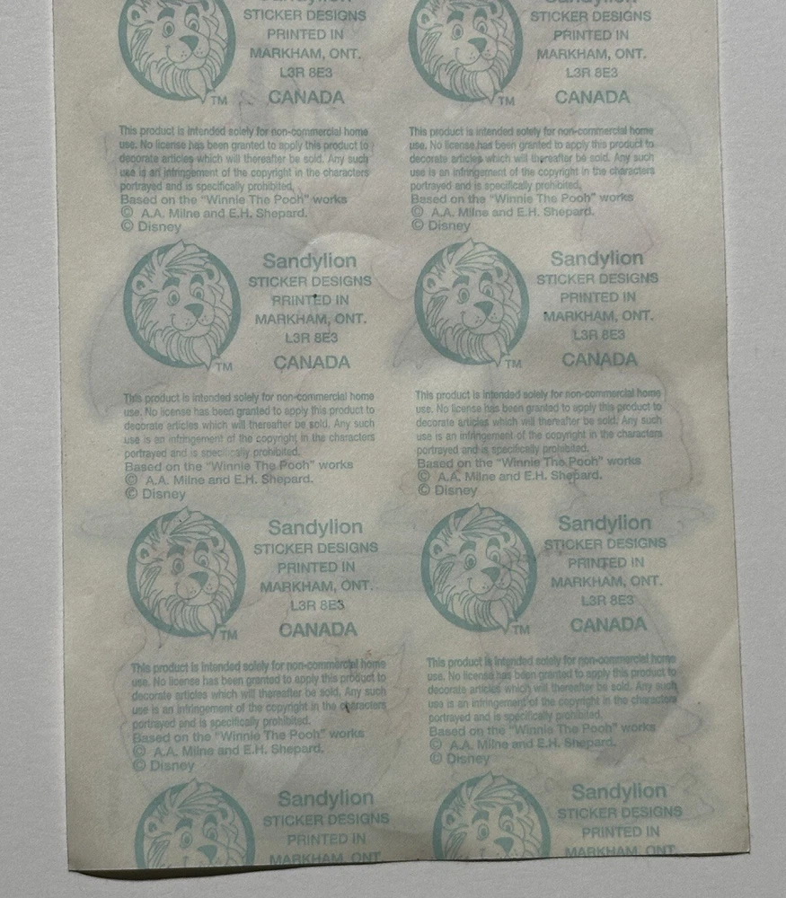 Vintage Sandylion Winnie The Pooh & Friends Rain Sticker Sheet New -No Packaging