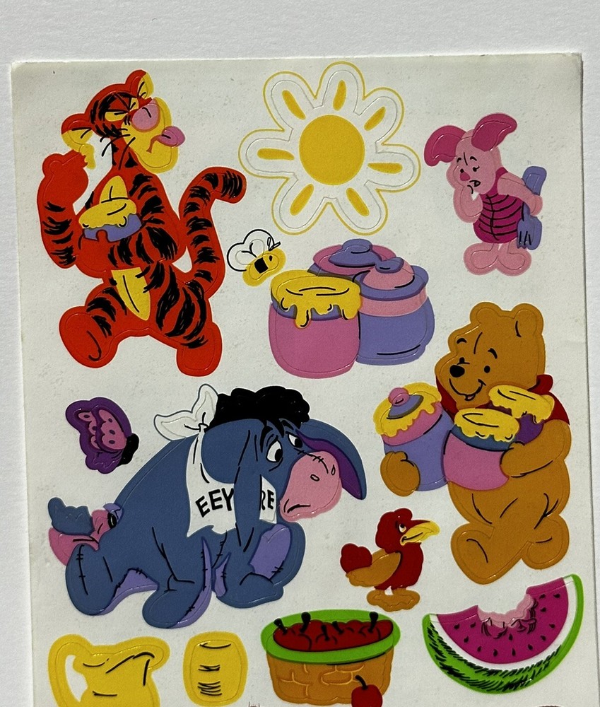This sticker sheet from the vintage Disney and Sandylion collaboration. It features Winnie the Pooh and friends having a yummy picnic in the sun. These stickers will make a great addition to any vintage sticker collection, Winnie the Pooh fan, and/or crafter! The sticker sheet is in great, vintage condition with normal signs of wear from handle and time. Please review all of the pictures and ask any questions as this is sold as is. Thank you for your time! :)