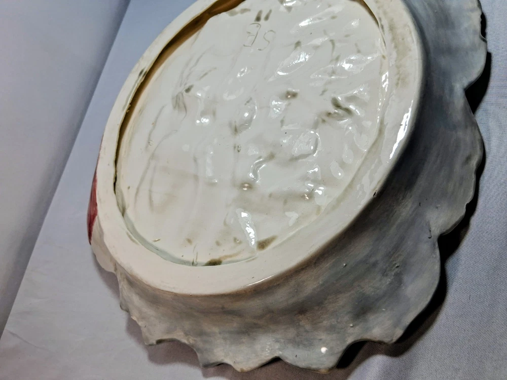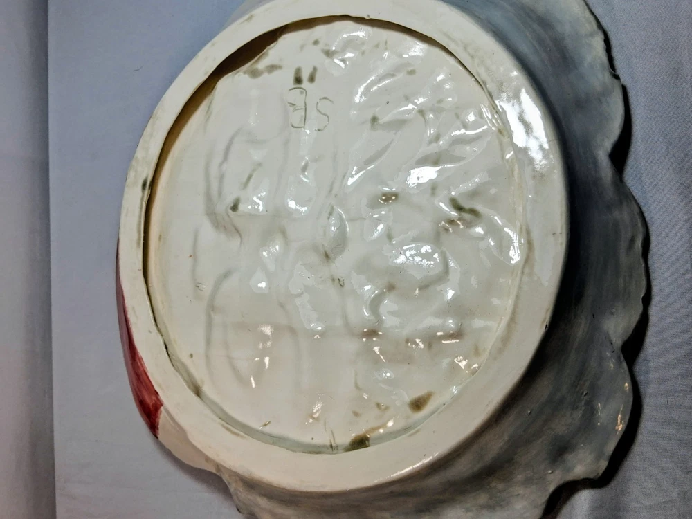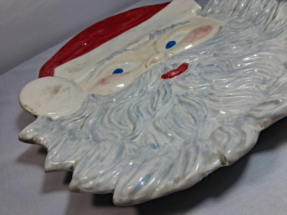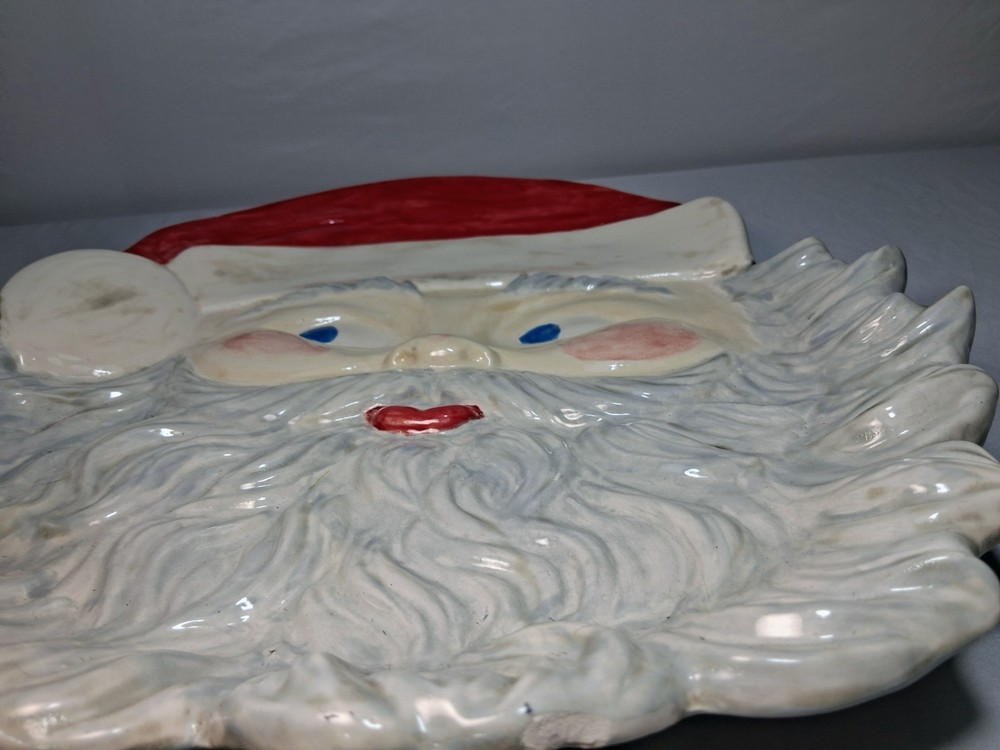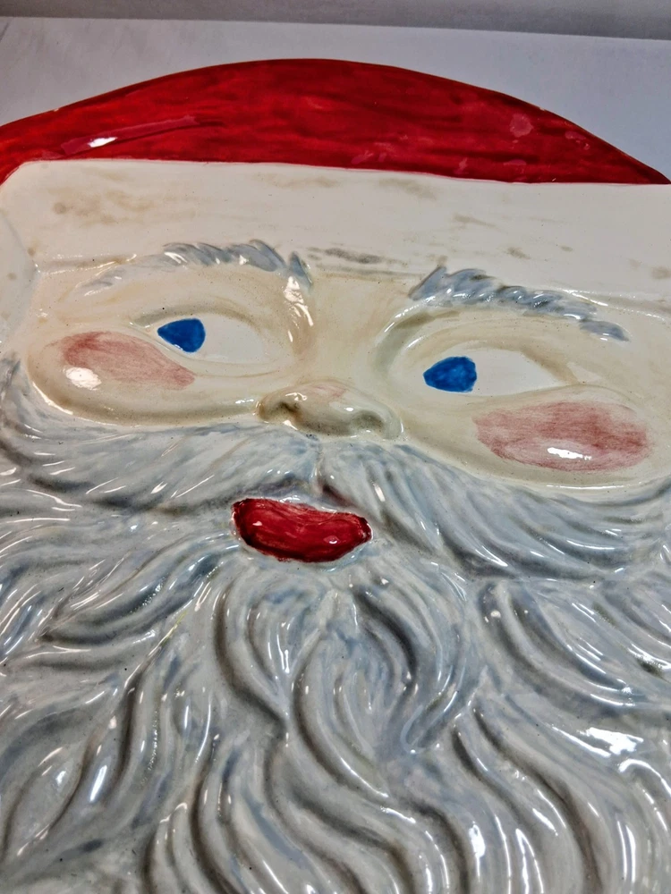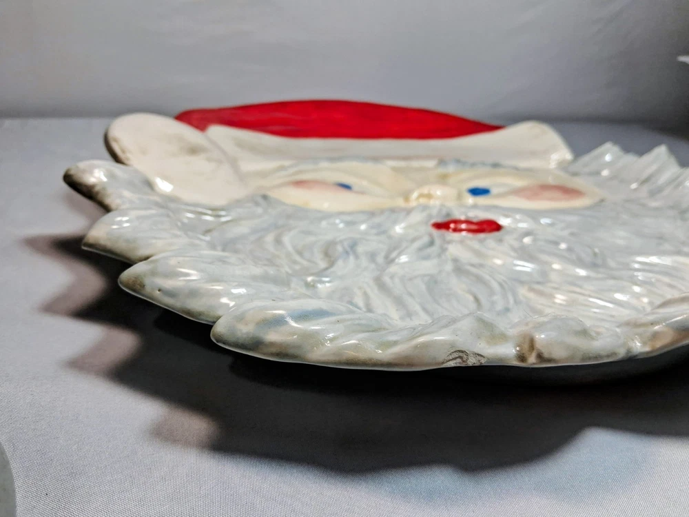 This vintage Santa Claus ceramic cookie plate serving tray mold is a retro collectible perfect for Christmas. Handmade in the United States in the 1970s, it features a classic red and white color scheme with a festive Santa Claus face design. Small chips shown in picture. This unique piece adds a touch of nostalgia to holiday baking and serving, making it a charming addition to any Christmas decor collection.